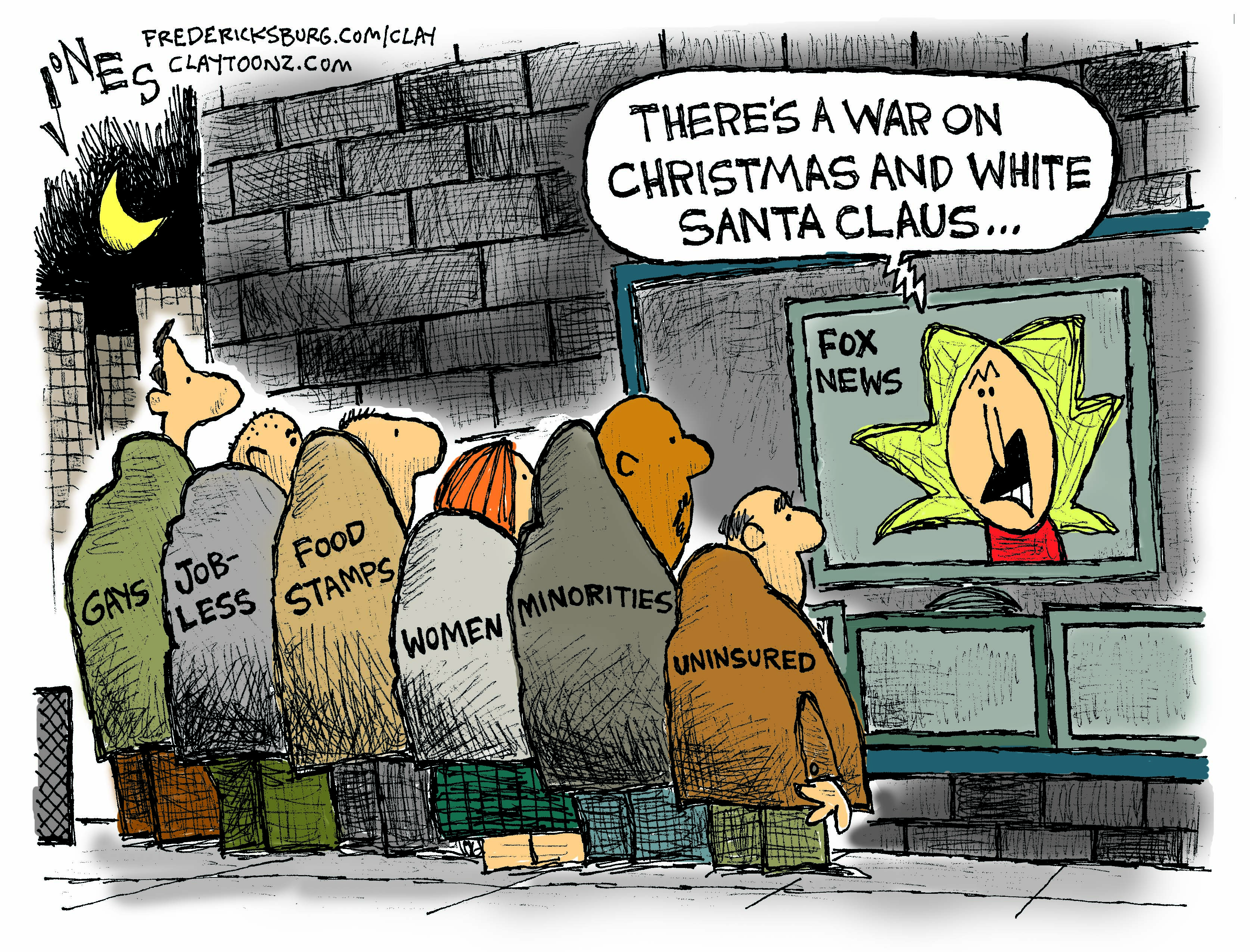 I talk to a few conservative friends who insist there is not a war on women, or any of the groups I placed in the cartoon. Yet they’ll argue there’s a war on Christmas. You can’t go anywhere starting mid October without seeing Christmas displays and hearing Christmas music everywhere. Everyone trying to sell a product on TV uses Christmas in their commercials. If there’s a war on Christmas, Christmas is winning. I think the people who are actually a threat to Christmas are those who made the holiday into one big commerce generator.