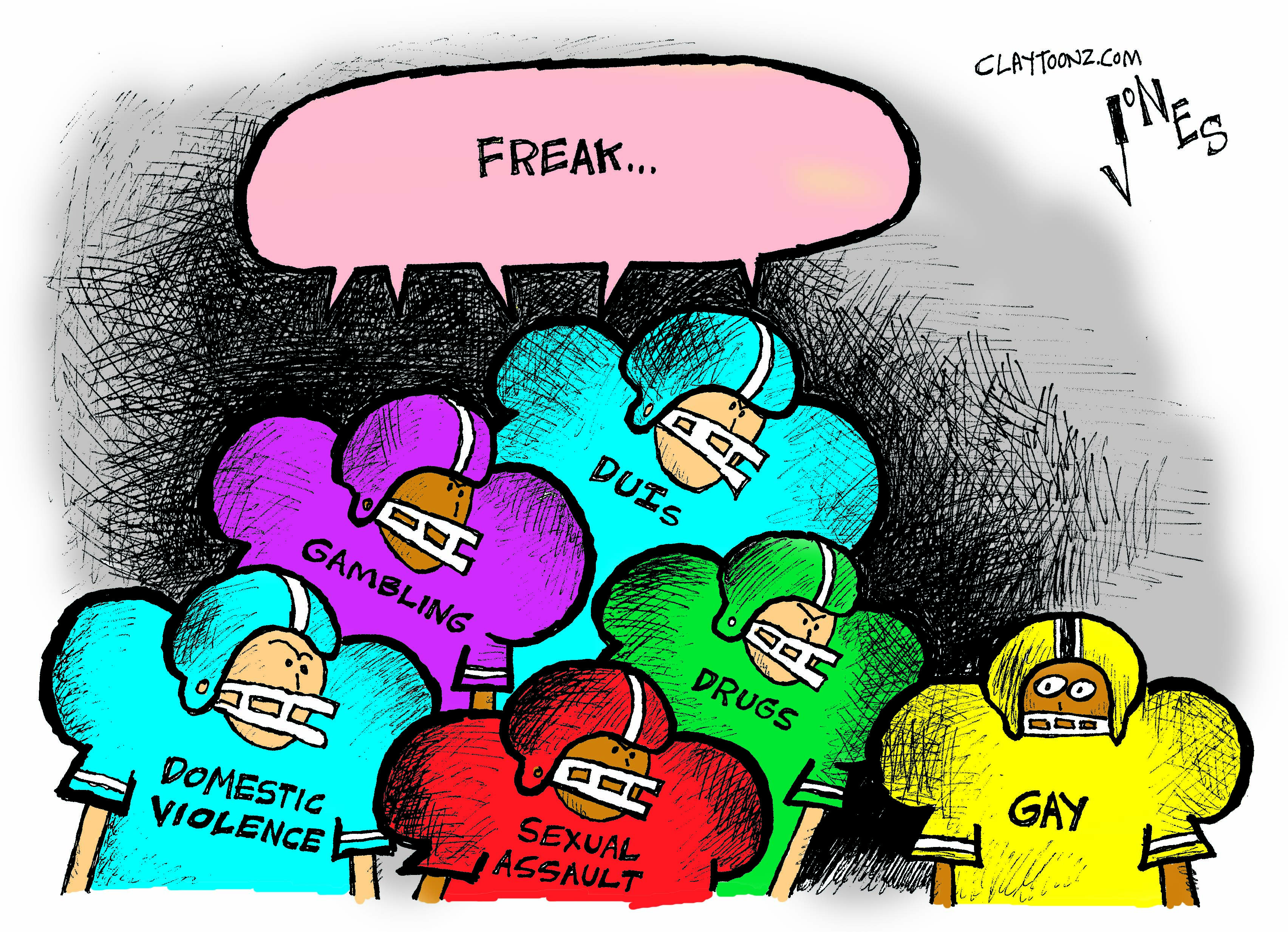 We’ve seen so many NFL players, and professional athletes in other sports, become guilty of the labels I put into the cartoon. If they can play, their transgressions are usually pushed aside and they’re signed to a team. It’s a shame that being gay is more of a liability.