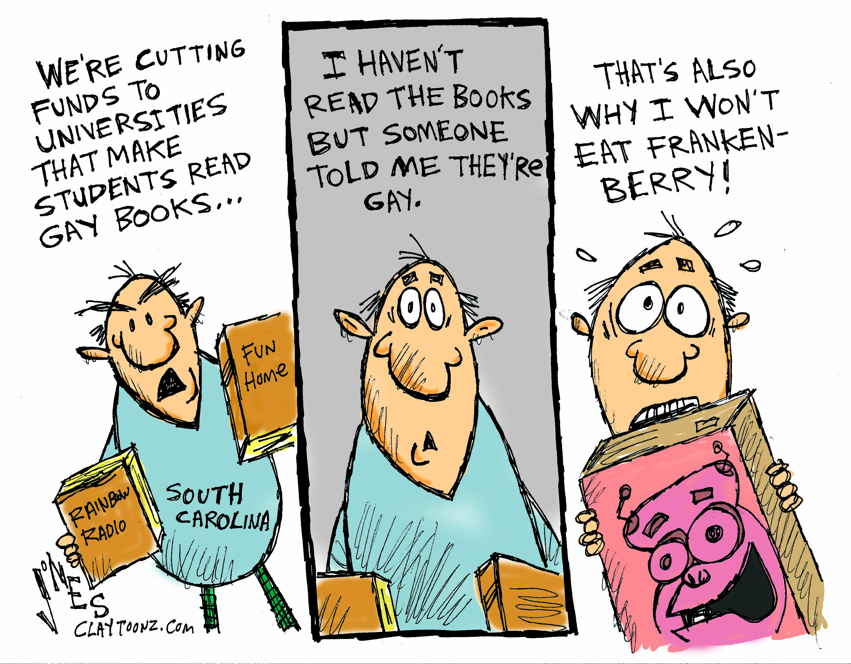 The South Carolina legislature will vote this week to reduce funding for two universities for requiring all their freshmen students to read books with gay themes. These schools assign a book every year, semester or something like that. This time two of the books have gay themes.