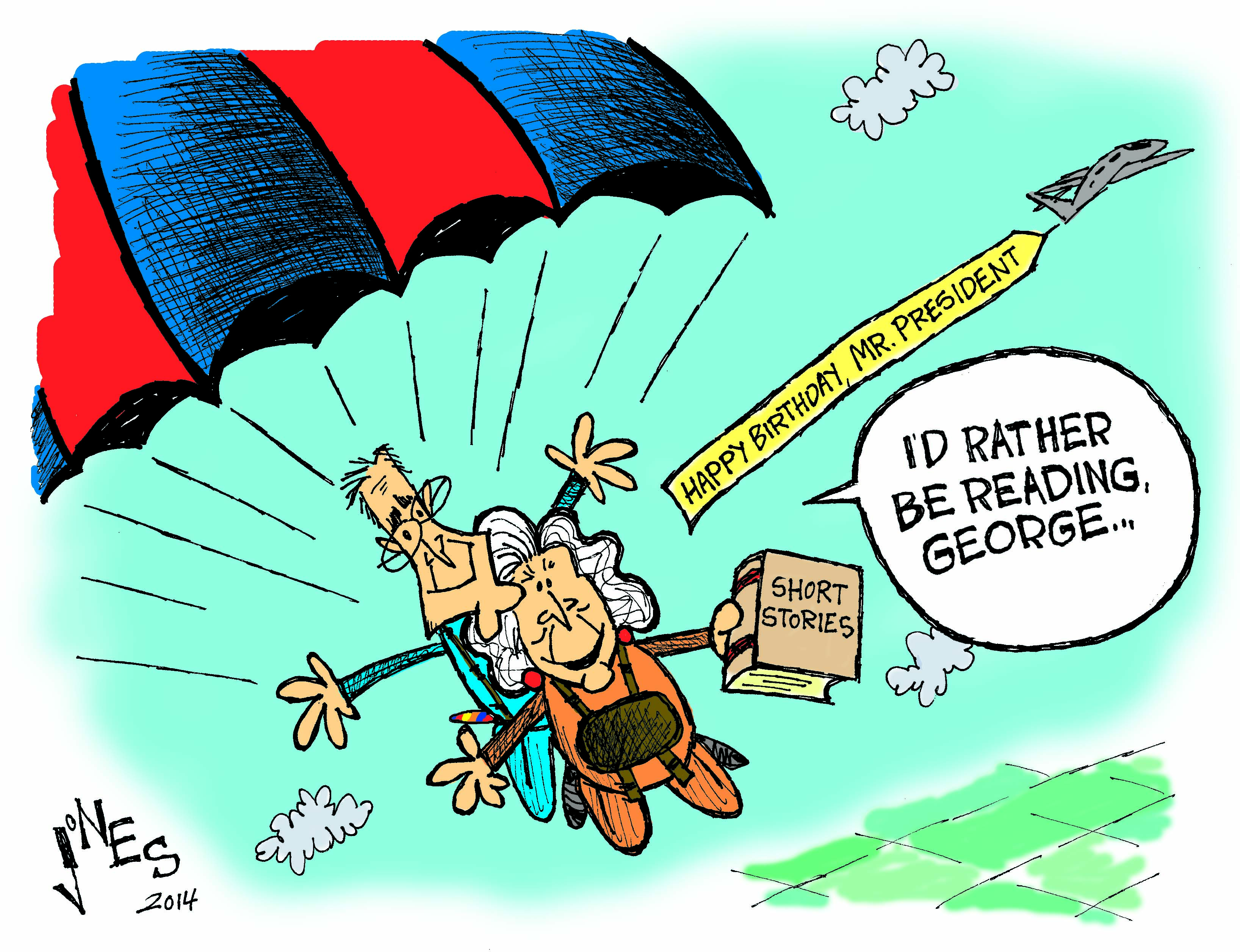 Occasionally I will do something for a foundation that’s non-political. Yesterday morning the Barbara Bush Foundation For Family Literacy asked me to draw a cartoon for George H.W. Bush’s birthday and on the fact he planned to jump out of a plane again. The catch for me was they wanted it that day. They gave me the idea which was based on an illustration I drew for them last year. They’re good to work with and it was a lot of fun despite the drawing being needed on the same day I had two other commissions with a one-day deadline.