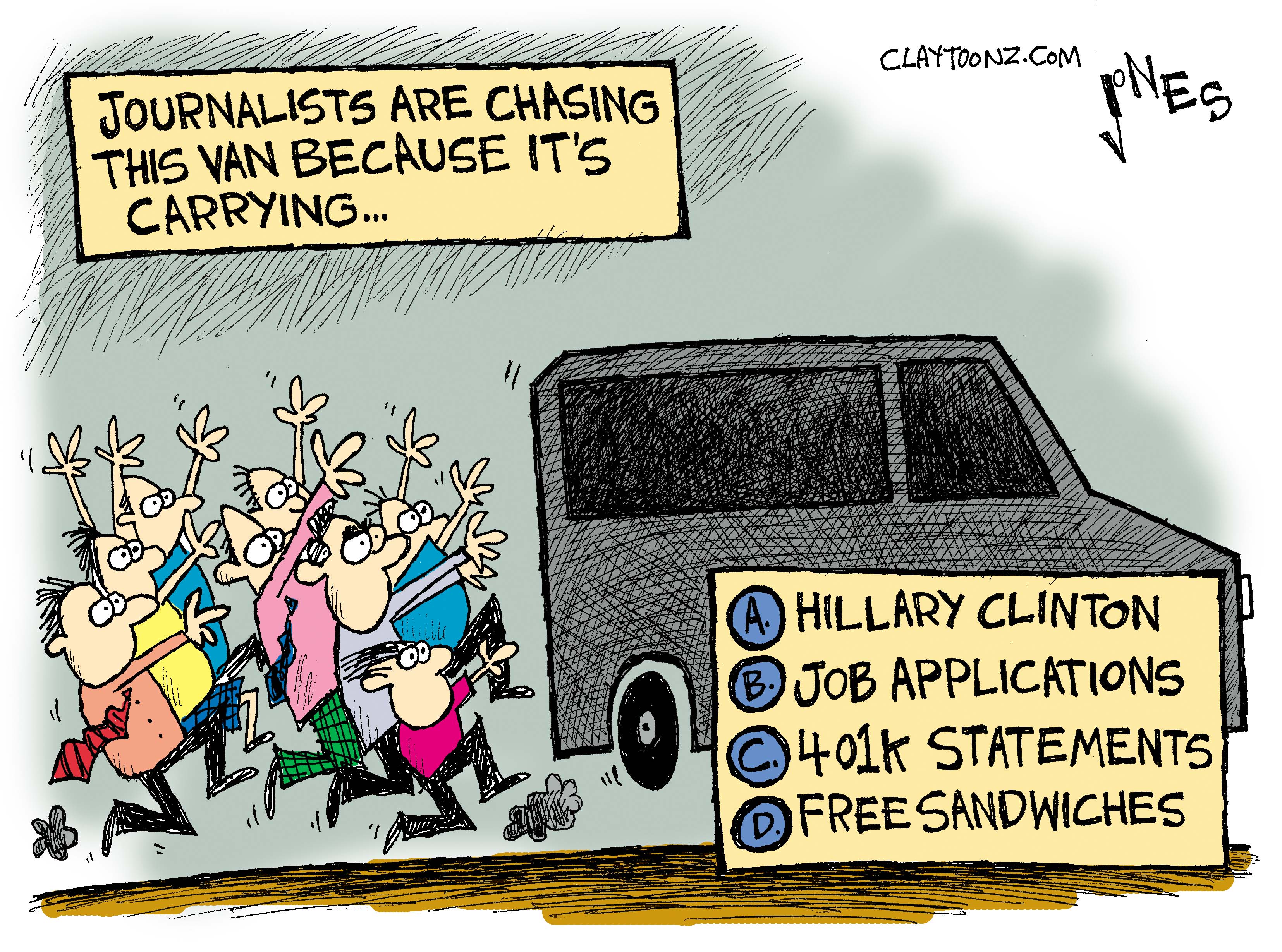I was watching the news when that flock of reporters went running across a field after Hillary Clinton’s “Scooby” van. I felt embarrassed. We’re going to have over a year of Hillary Clinton running for president, but everyone in the press has to run after her vehicle to maybe get quick footage of her going from a van to a building.