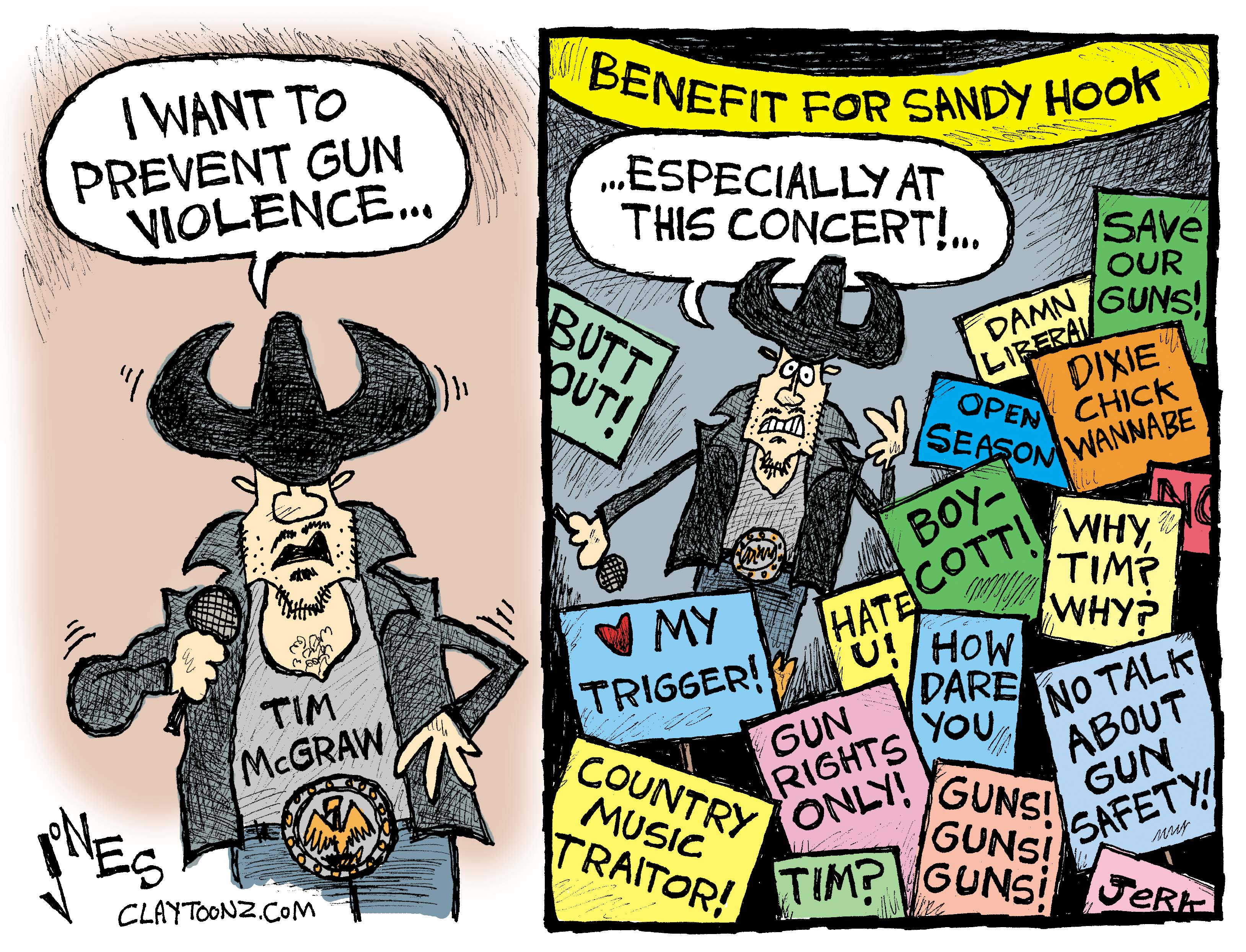 Tim McGraw is the headliner for this show and his fans are threatening to stop buying his music, or even stealing it on the internet. Country fans consists of gun nuts and interpret “hey, maybe exercising some gun safety” as a threat to their right to own guns and accidentally shoot their own foot off. They fail to see that they’re threatening McGraw’s constitutional right to state his opinion.