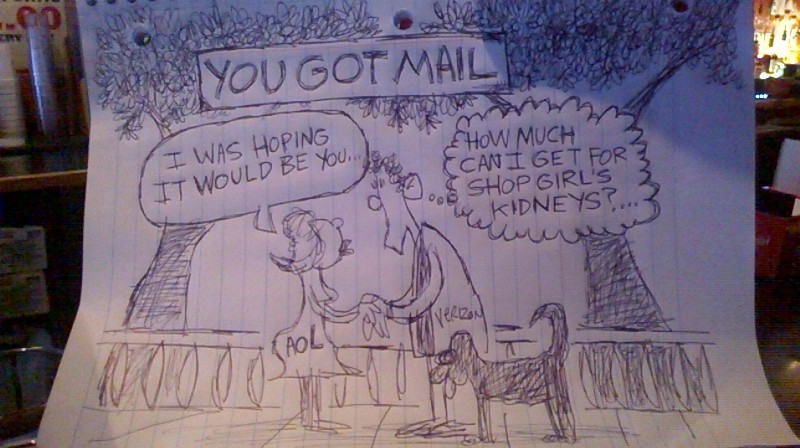 I drew up this idea in a restaurant. I’m always working. Here’s the sketch which I managed not to get any chicken wing sauce on. I made a couple of little changes like the title of the movie from “You Got Mail” to “You’ve Got Mail” and according to many websites, “Shopgirl” is one word. I’m disgusted I remembered her name was “Shopgirl.”