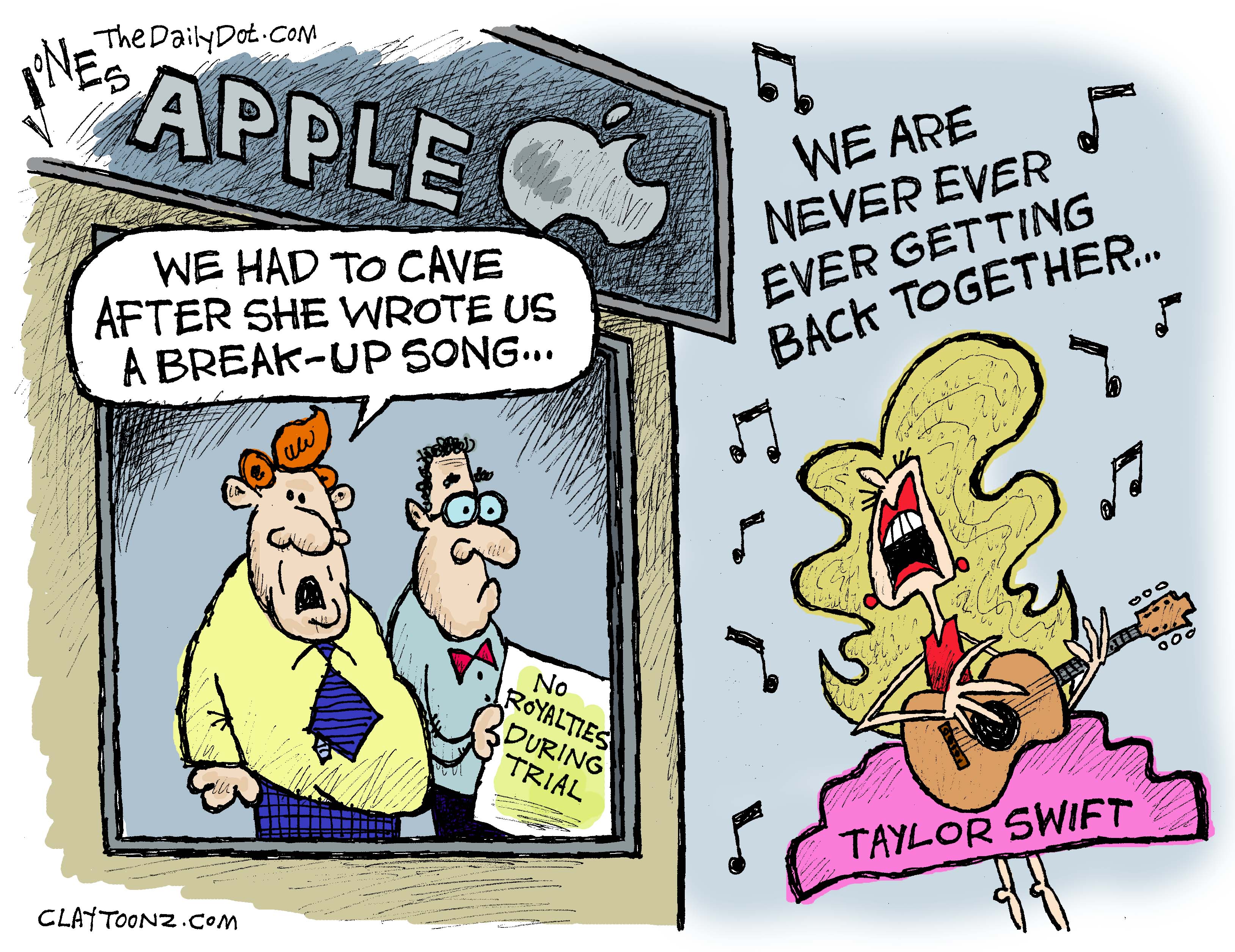 I’m a little familiar with Taylor Swift’s music. A few years ago a few girls I know, who are all much younger than I am, introduced me to her music. I didn’t really have a choice. I don’t know everything she’s done and I haven’t listened to anything new of hers in a long time. But I found a few song titles that might have worked for this cartoon other than the one I settled on. Those songs are “Mine” and “Mean” and “I Knew You Were Trouble.”