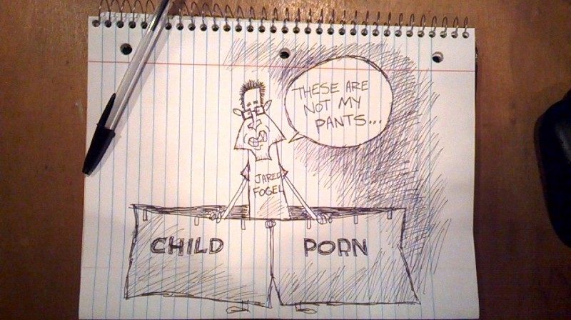 I drew this Wednesday night. Sorry we’re just now getting it posted. My editor suggested the topic and I wasn’t sure about it. A former employee of his Fogle’s charity is facing child porn charges. There is a very good chance Fogle is a victim here. I am curious why his home was raided. Did his employee use computers or software in the Fogle home? I think it’d be helpful if Fogel’s reps would comment on that.