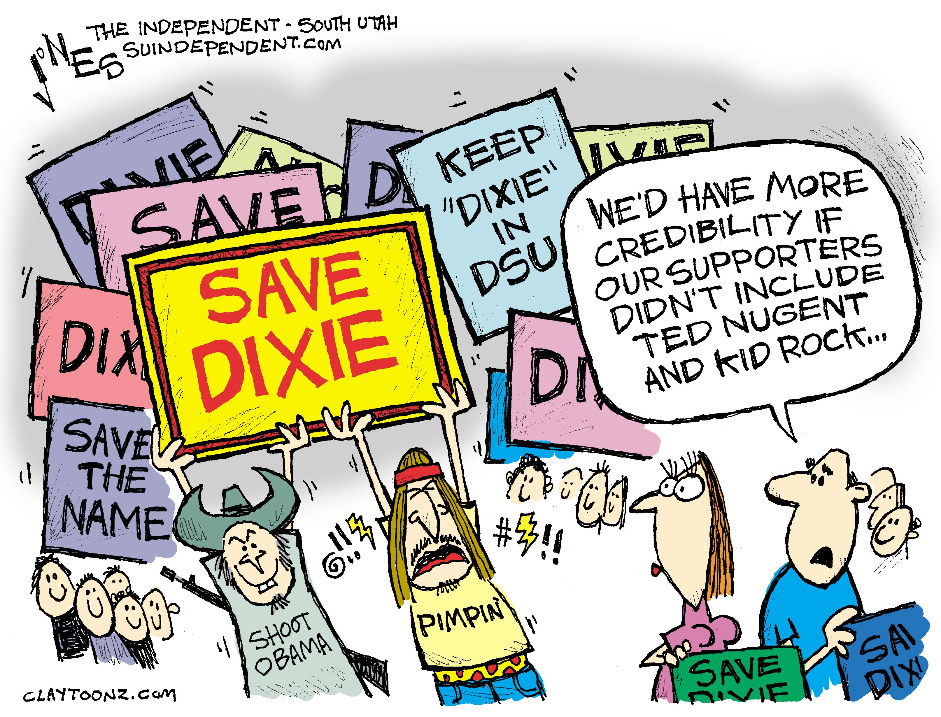 I don’t have much of with Dixie being thought of as racist. Dixie is not racist and refers to the South, not racism. The Confederacy doesn’t exist anymore but Dixie does. Though that song “Dixie” can be construed as racist (it was big during the Civil War and features the lyrics “old times there are not forgotten”). If Dixie State University was actually in the South I would support them keeping the name (we can’t get rid of everything and not everything is offensive).