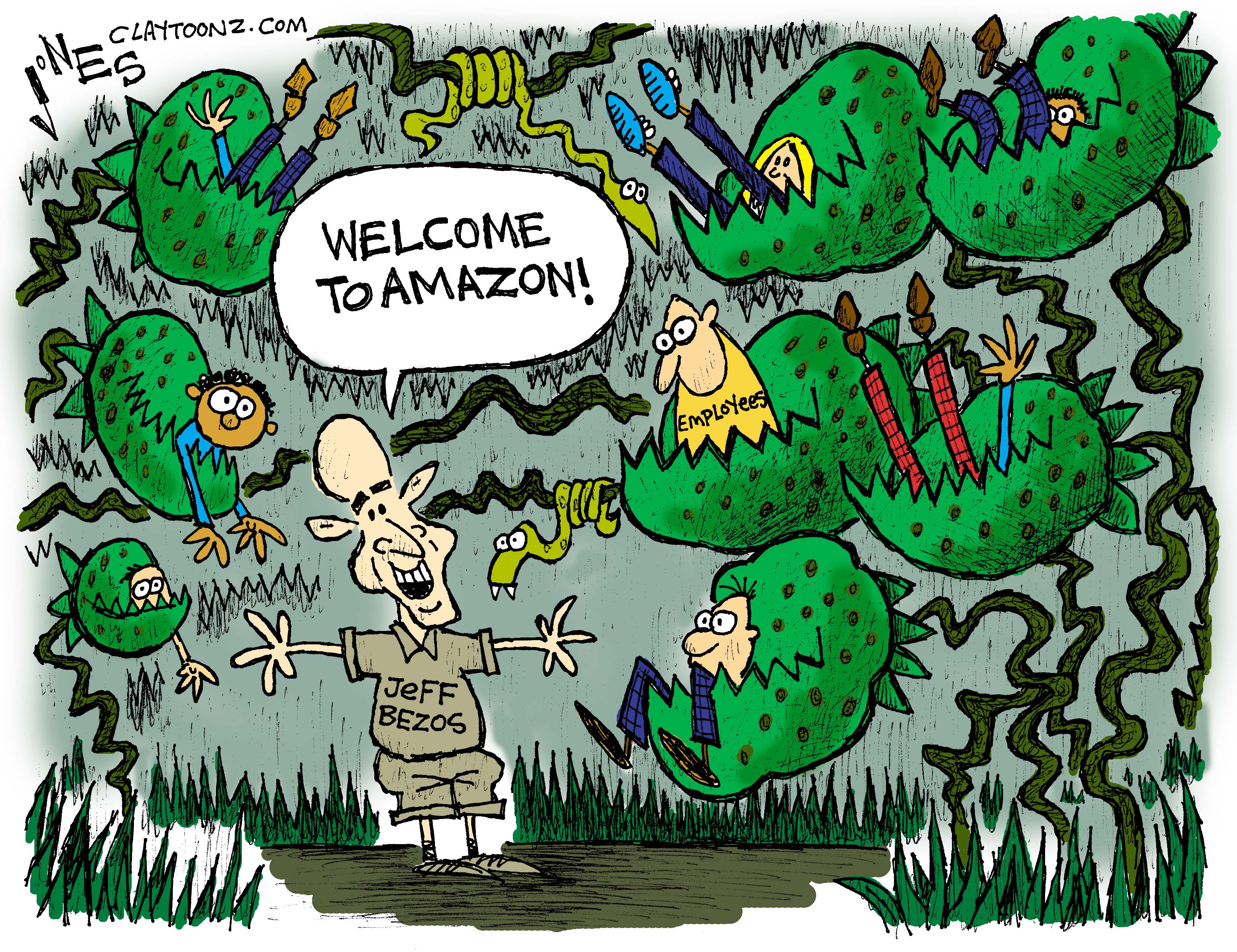 This cartoon took a while to color. I drew the cartoon super early Wednesday morning and finished it around 6:00 AM. It took forever to color.My giant Venus Flytraps are influenced a tad by Little Shop Of Horrors. Feed me, Seymour! Feed me!
