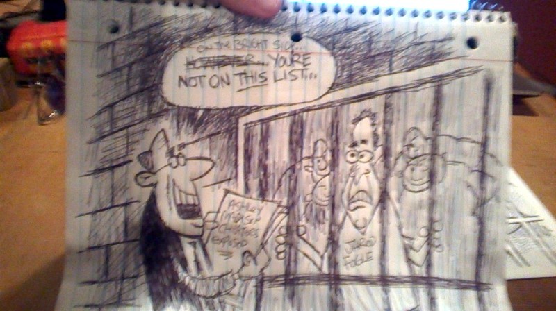 He laughed immediately when he saw it. He kinda inspired this idea by making a pants statement we both immediately forgot. However, after showing both to another friend I decided to go with the cartoon that covered Fogle and Ashley Madison.