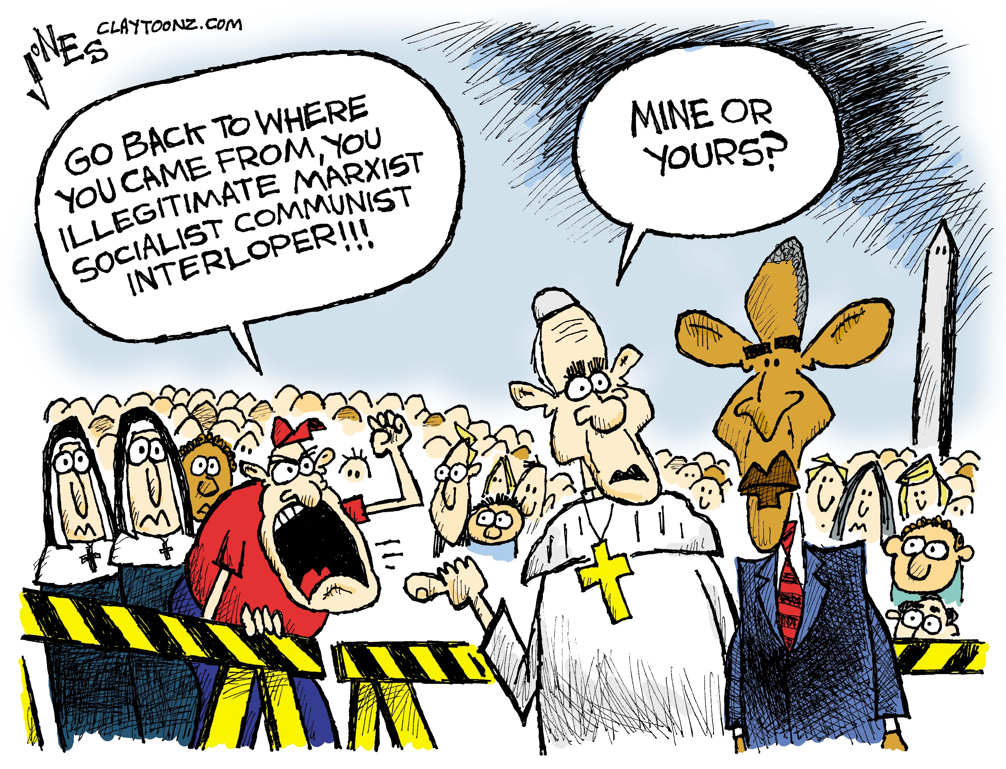I rejected my first idea. I was going to draw some wing nuts upset the Pope was visiting communists and then say “and he’s meeting with the Castros too.” I figure that idea might be obvious. We’ll see in a day or so and I probably just gave the idea to someone reading this.