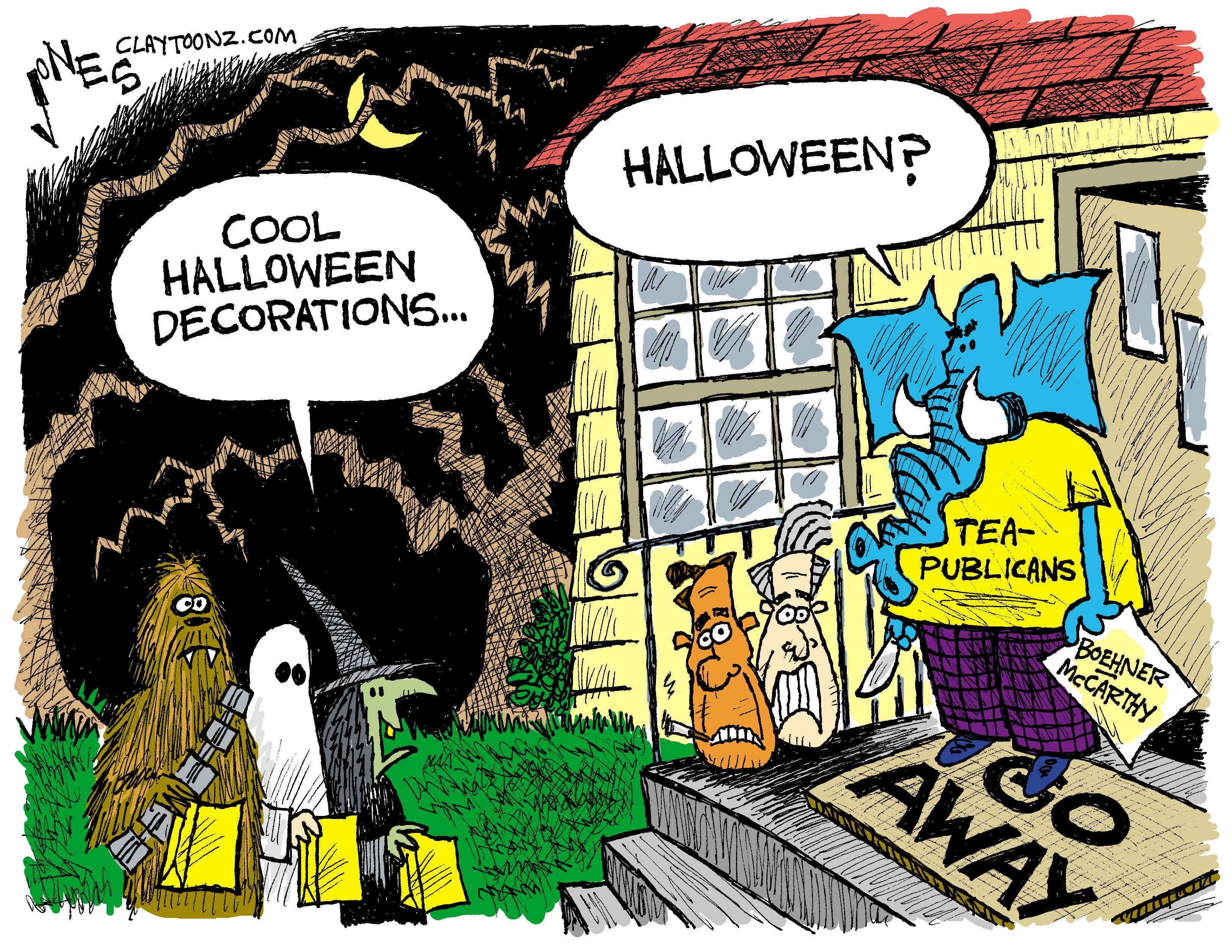 I have drawn my share of holiday-cliche cartoons throughout my 25-year career. The past few years I’ve done a good job of avoiding them. It’s my attempt to be original, irreverent, interesting…not boring. I am bored with drawing Cupids, Santas, Christmas trees and turkeys. You always see a thousand cartoons of sitting on Santa’s lap, a turkey about to get his head chopped off, the Ground Hog, and trick er treaters. Halloween is a lot harder to avoid because the imagery is a lot more fun than other holidays. So I gave you a few treaters today but I think I made up for it by throwing in a Wookie.