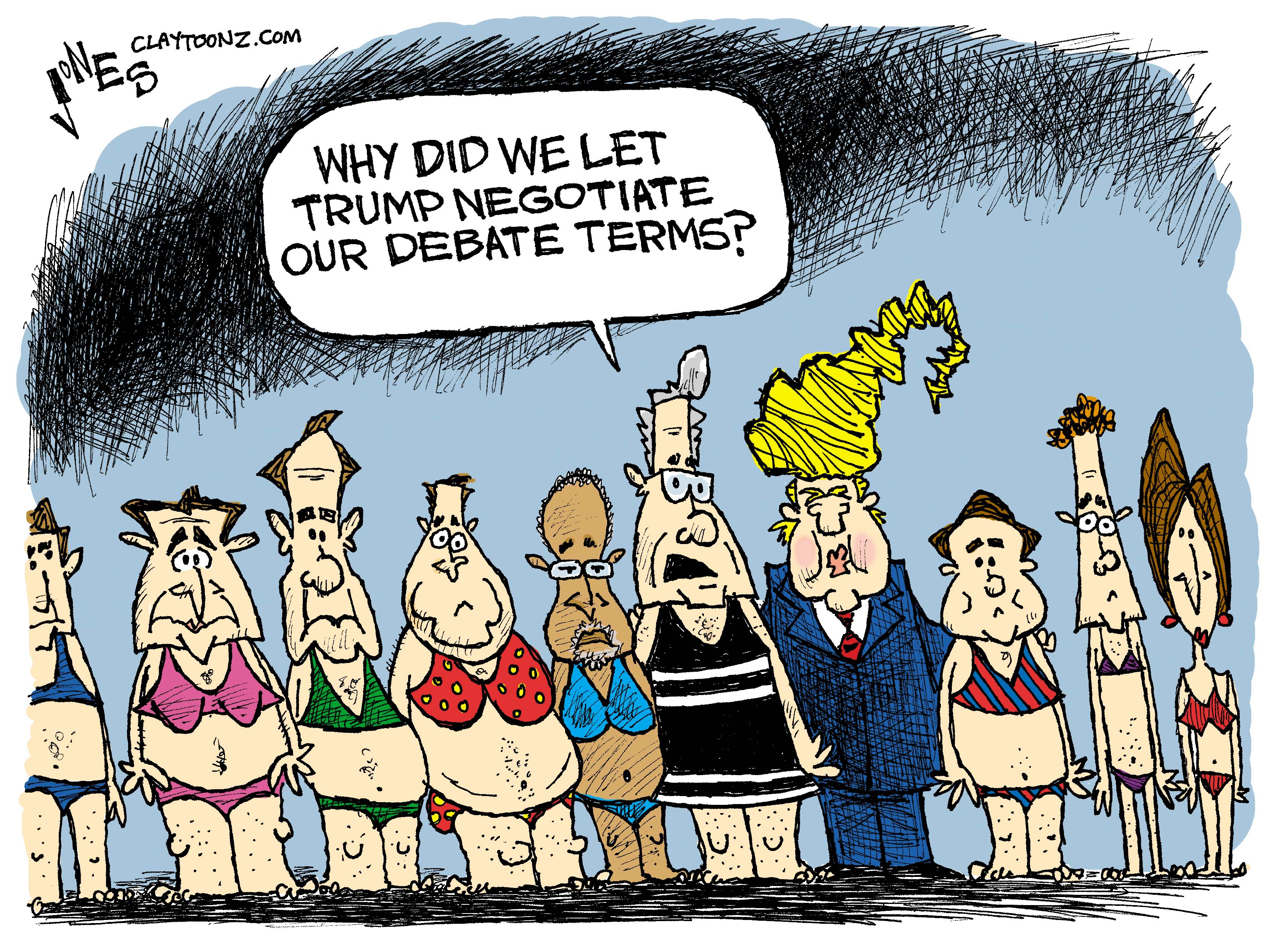 I think I drew the candidates in bikinis a couple of months ago. I can’t remember when or what point I was making (I just looked it up. I drew them as transgenders and it was published June 2). I usually can’t remember what I drew yesterday. However I do remember that yesterday I drew soldiers in women’s heels. I don’t know why I like drawing guys in drag. I’m not right. I’m going to blame it on watching too many Bugs Bunny cartoons as a kid. I also like the idea that somewhere soon someone will gag on their Cheerios while reading their morning paper. I also get small pleasure when someone informs me I made them spit coffee on their keyboard.