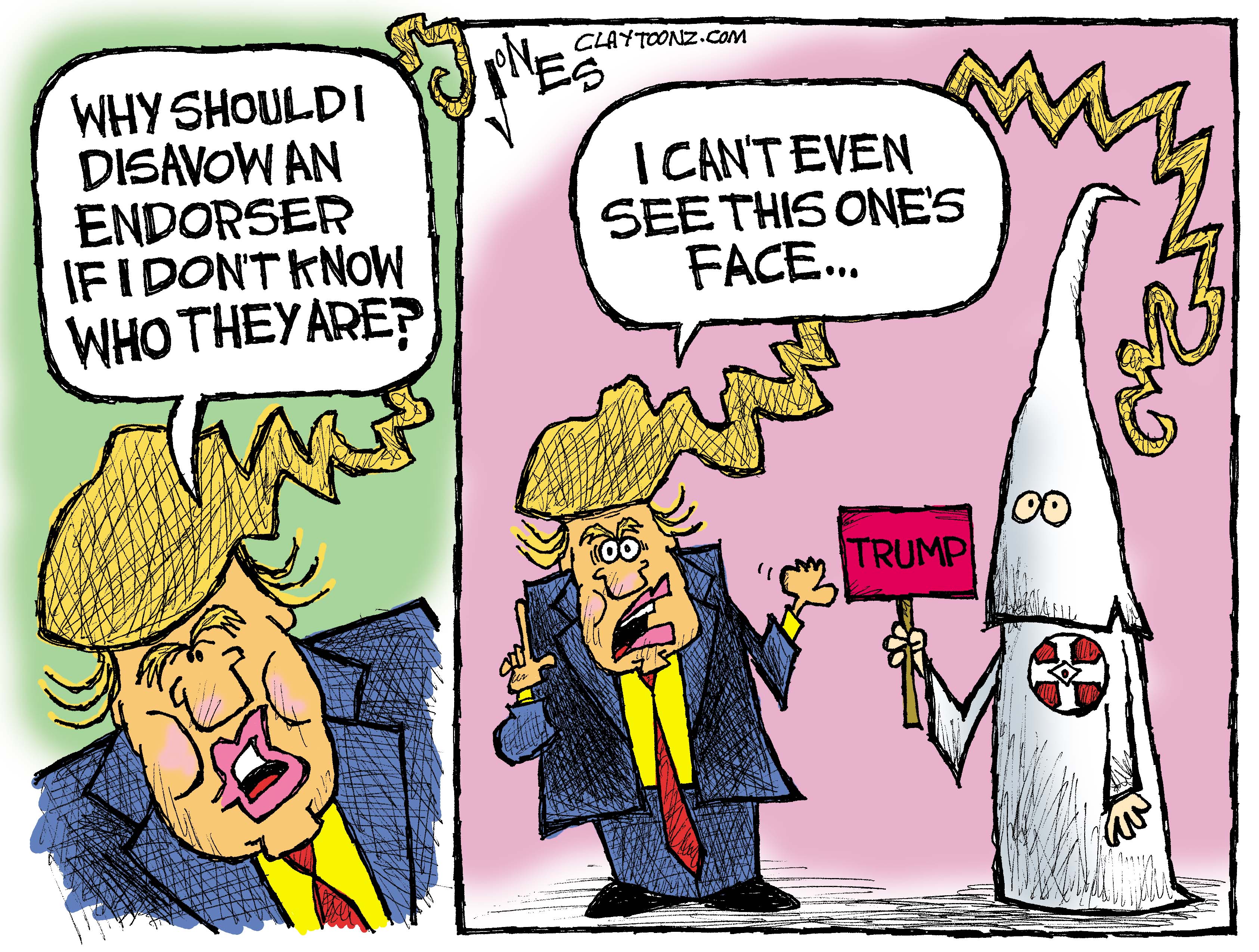 Not being familiar with racist groups was his excuse on CNN Sunday morning when asked if he’d disavow the endorsement. He wouldn’t. But about two hours later (after someone probably told him that being associated with the KKK might seem kinda negative), Trump disavowed the Duke endorsement. He did it in a begrudging manner too like “OK you babies, I disavow, now watch me roll my eyes. Are you happy now? Leave me alone.” Why can’t a guy go out and troll the nation with racist comments without attracting Klansmen? Sheesh!