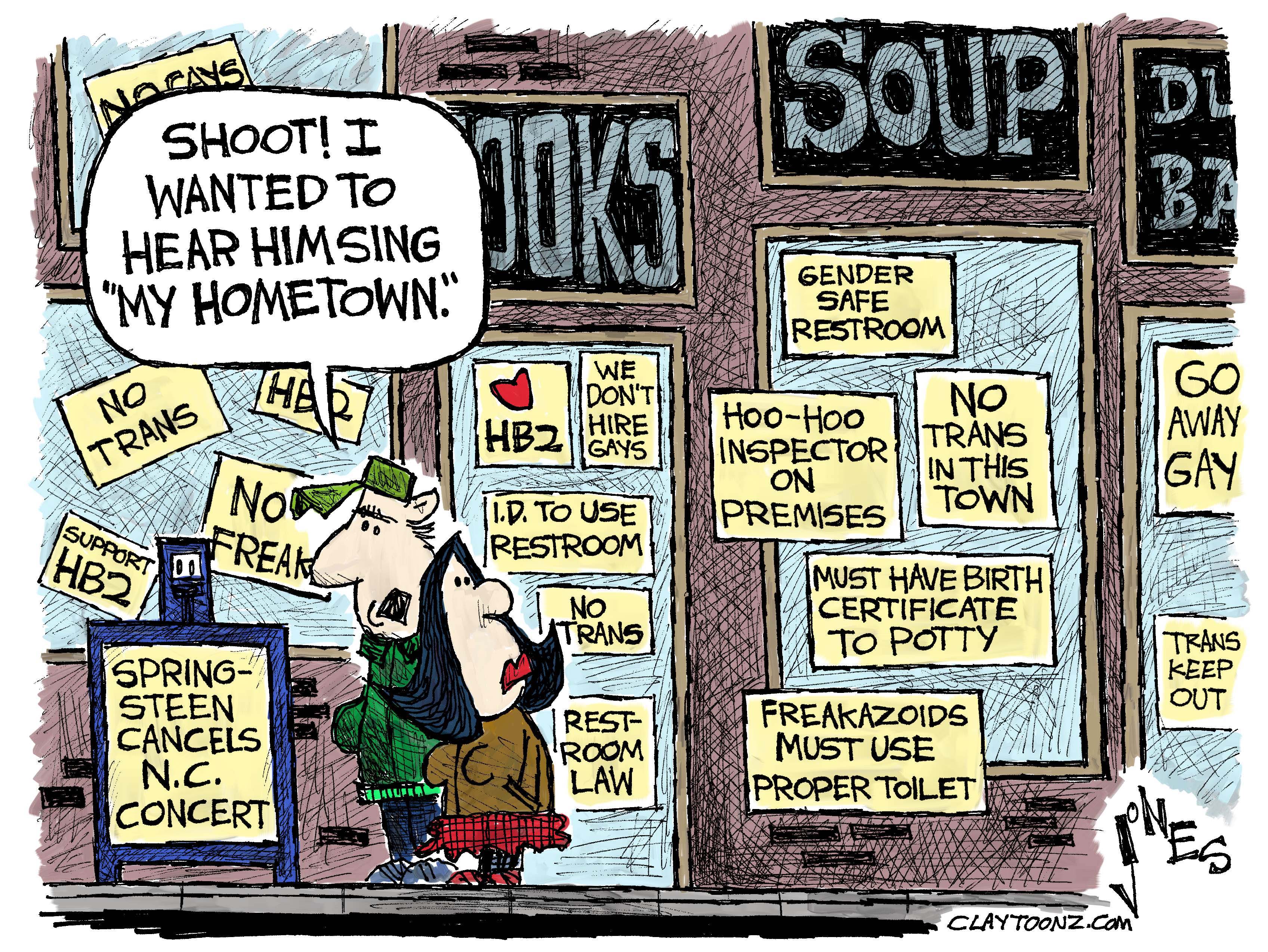 Springsteen has canceled a concert in Greensboro, North Carolina in protest of that state’s recent hate law. This is the law that specifies people must use public restrooms and locker rooms that’s in line with the gender specified on their birth certificate, as if everyone walks around with a birth certificate. The law also protects businesses from lawsuits that result from their discriminating against homosexuals, transgenders and such. It also prevents localities from passing laws protecting the same people.