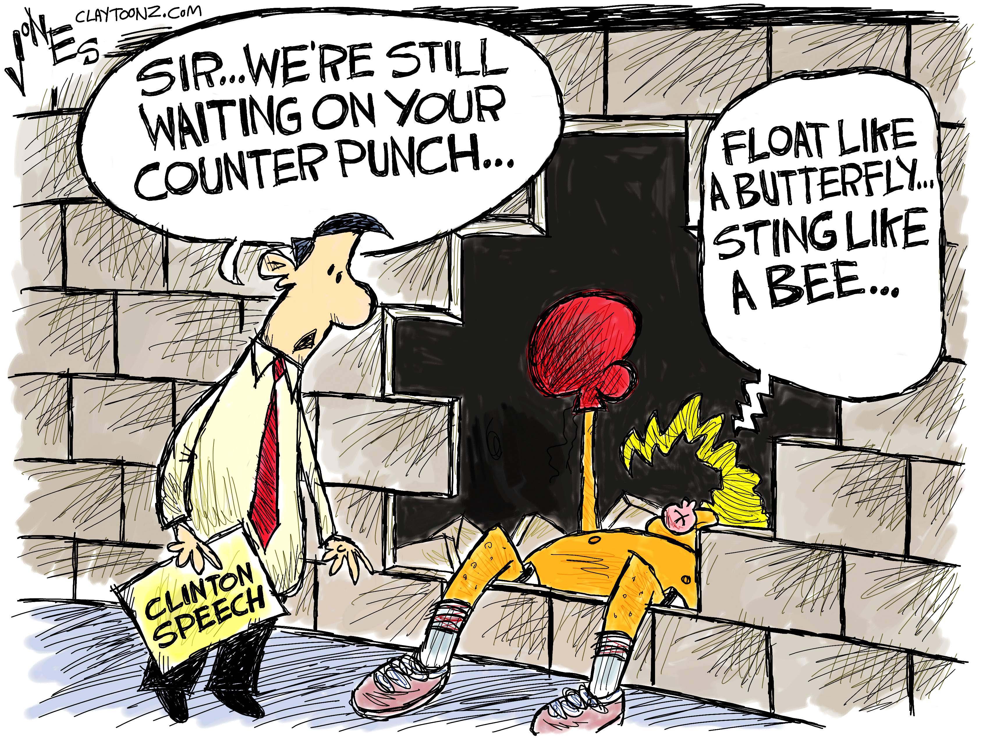 Then again, maybe he’s just stupid. Ali could do more than deliver a punch, he could take one. So can Hillary Clinton. Trump can dish ’em out, but the man has an orange-glass jaw.