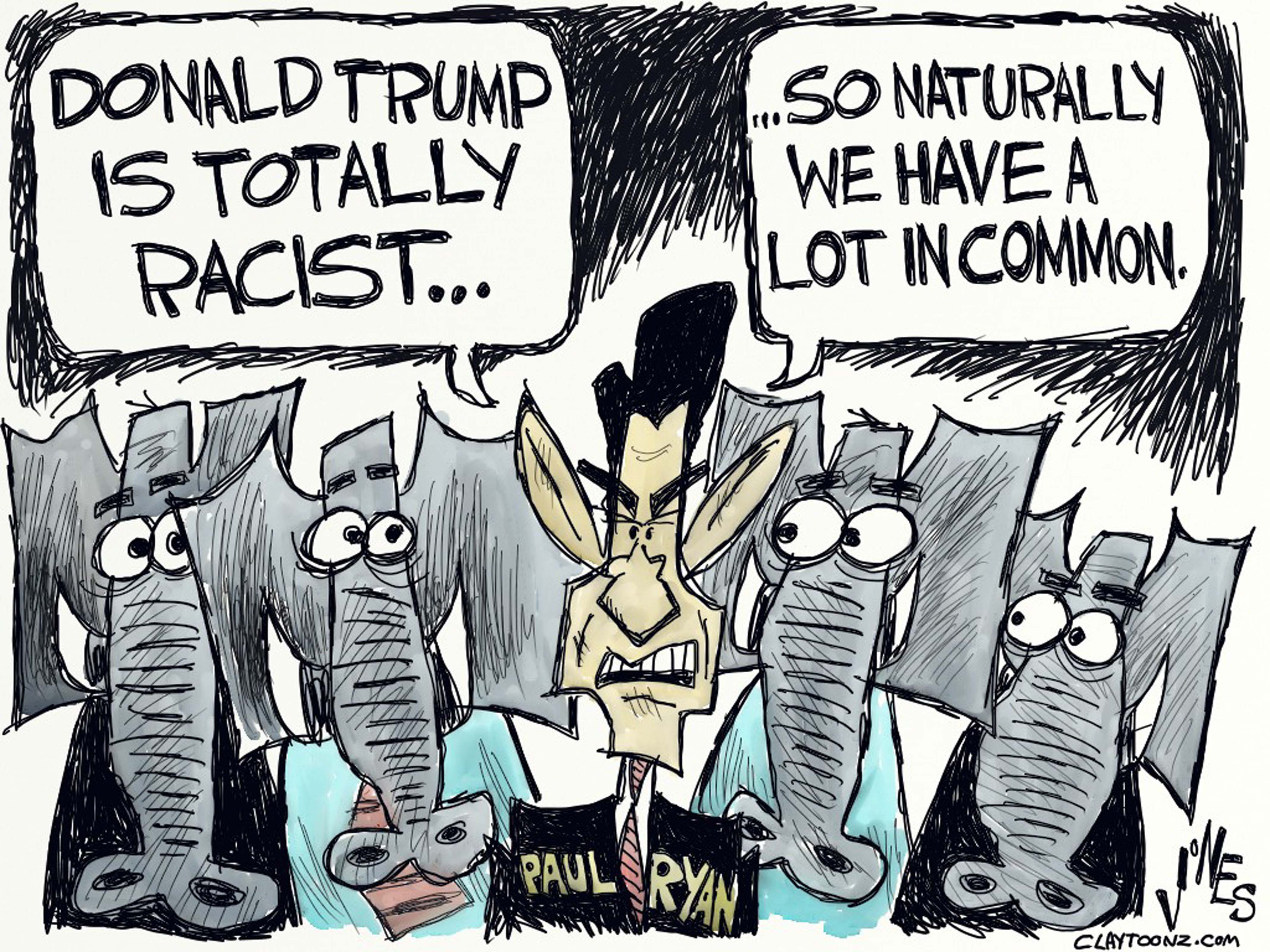 On the same day Speaker of the House Paul Ryan said he was voting for Donald Trump, note he didn’t say “endorse”, he had to make a statement condemning Trump’s racism. On Tuesday he actually came out and described Trump’s statements toward a judge as “racist.”