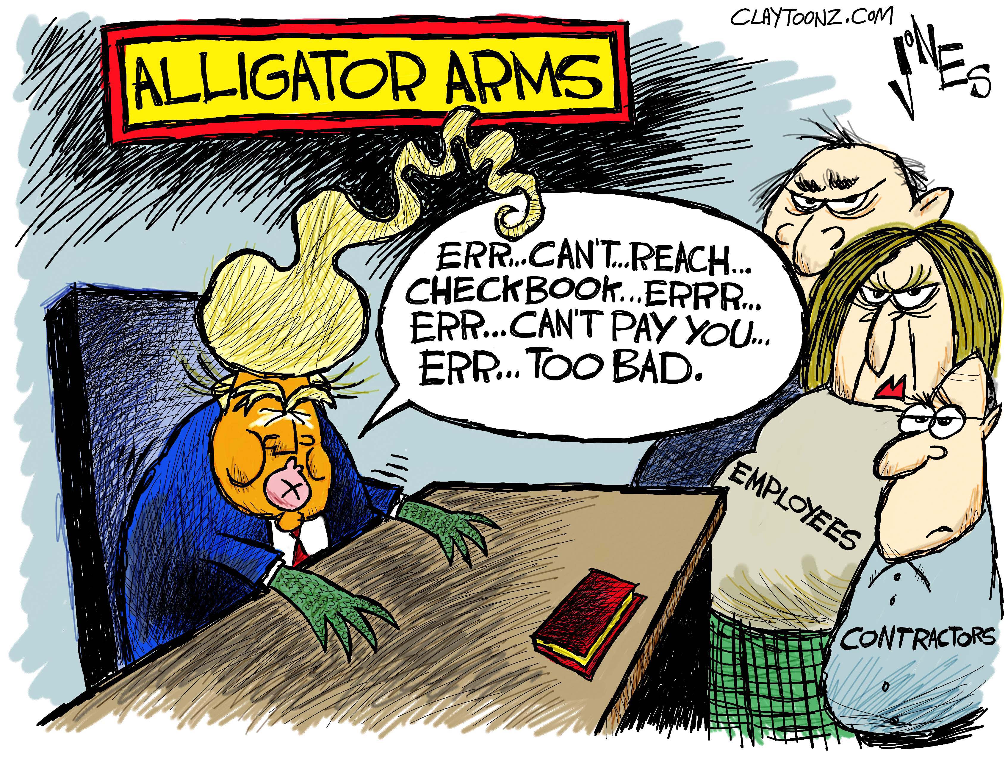 I’m not often amused by Geico commercials, especially the ones with the gecko. He’s annoying. But I liked the one with alligator arms. It shows a group of people at a restaurant and one of them is an alligator, who volunteers to pay for the meal. Unfortunately since he has alligator arms he can’t reach the check. I’ve been wanting to use the concept for a cartoon for a few days now.
