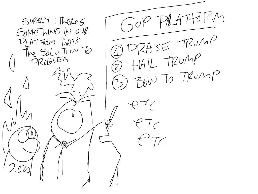 This is mocking Ivanka’s speech about her daddy and really…why did the Republican convention feel we needed to hear from so many Trumps? We got Ivanka, Jr, Eric, Tiffany, Melania, Big orange cheesehead himself, one Trump wife, one Trump girlfriend, and…did I leave anyone out? And during Trump’s speech, he only mentioned one of his kids by name. I’ll let you guess which one that was. Anyway, I really like this grim reaper dude and I’m gonna reference this drawing in the future.