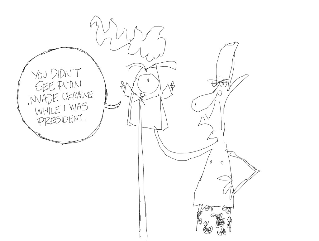 I liked this one but other things got in the way. I saw a lot of cartoons comparing Putin to Hitler and to Stalin. I don’t like the Hitler comparisons as much because it doesn’t seem Putin is trying to emulate Hitler, but I think he’s trying to be Stalin. I regret not drawing this one. I felt it would have been better at the start of the war.