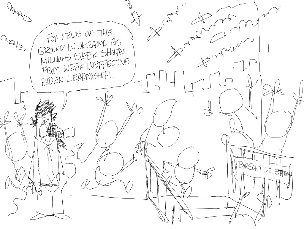 When there’s a huge news story like a war, a political cartoonist may draw a cartoon on that one issue for an entire week, and not draw a cartoon on anything else. So, each cartoon should focus on different angles or on whatever new thing from the war that breaks. What I don’t want to do is harp on the same thing repeatedly unless I can add something new. So, I did a cartoon on Putin defenders and I didn’t want to do too many more like that. That’s why this cartoon, which I do like a lot, didn’t make the cut. By the time I could do it, I felt the moment had passed.