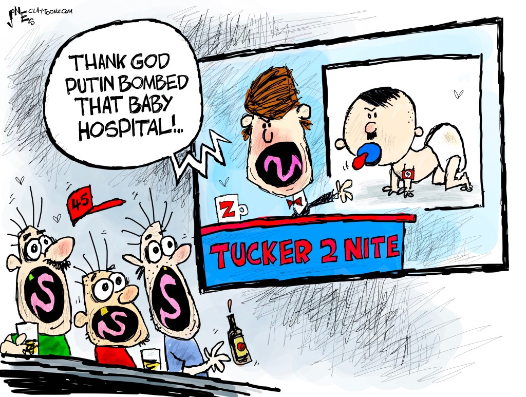 Even though other conservatives have stopped publicly cheering for Vladimir Putin and Russia, or at least most of them, Tucker is still pushing Putin’s propaganda. Even Donald Trump sees that public praise for Russia is a political liability, and it must be extremely painful for him to be biting his tongue to refrain from gushing out love for Vladimir Putin. The public may frown on calling a guy a genius who just bombed a baby hospital. But Tucker’s still in.