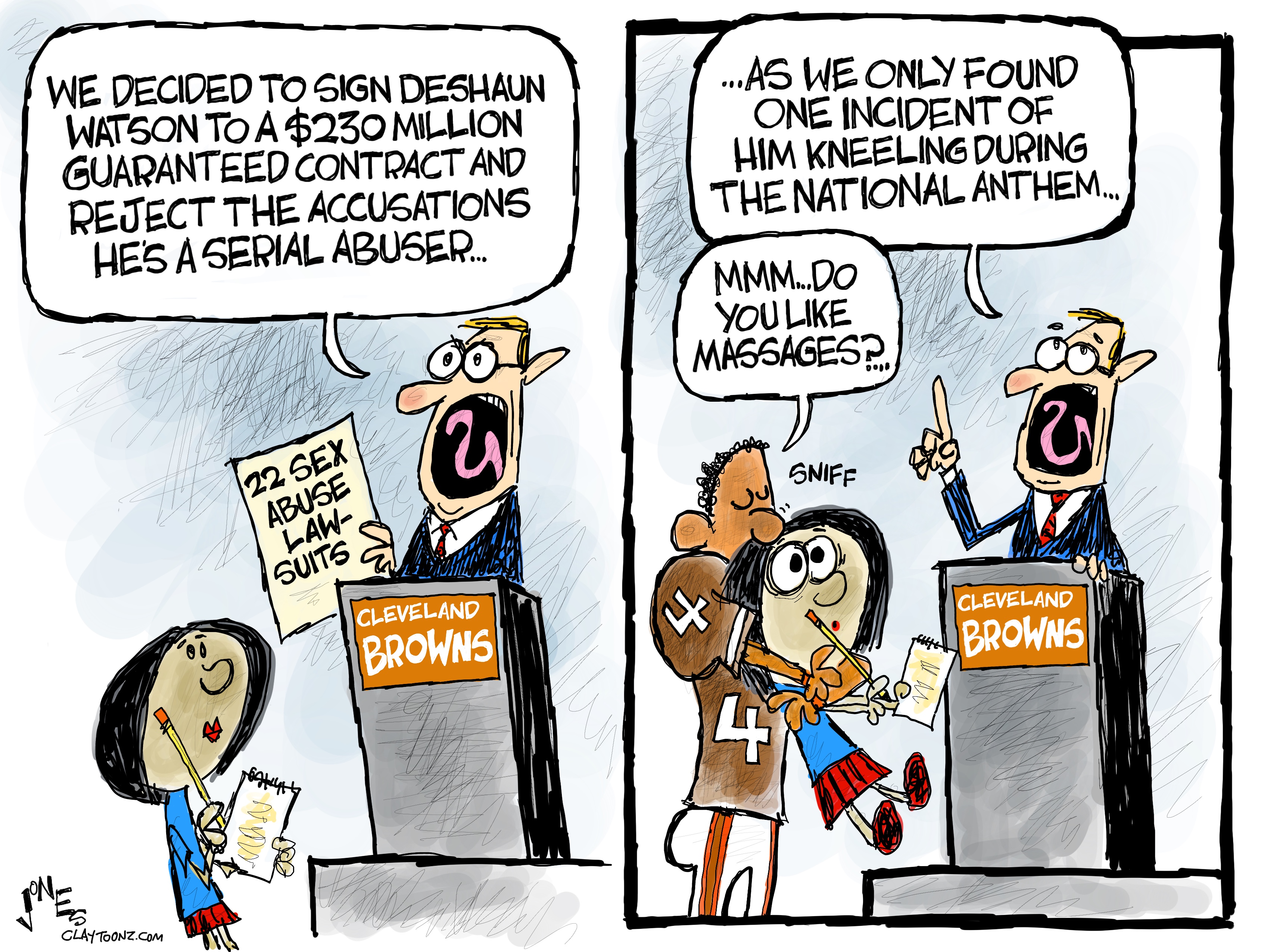 Deshaun Watson has escaped accountability. Sure, he’s innocent until proven guilty, but can 22 accusers be lying? The only people who used to believe that are Donald Trump and MAGAts. All those women are lying, and in the case of mall food court aficionado Roy Moore, he said he didn’t do it.