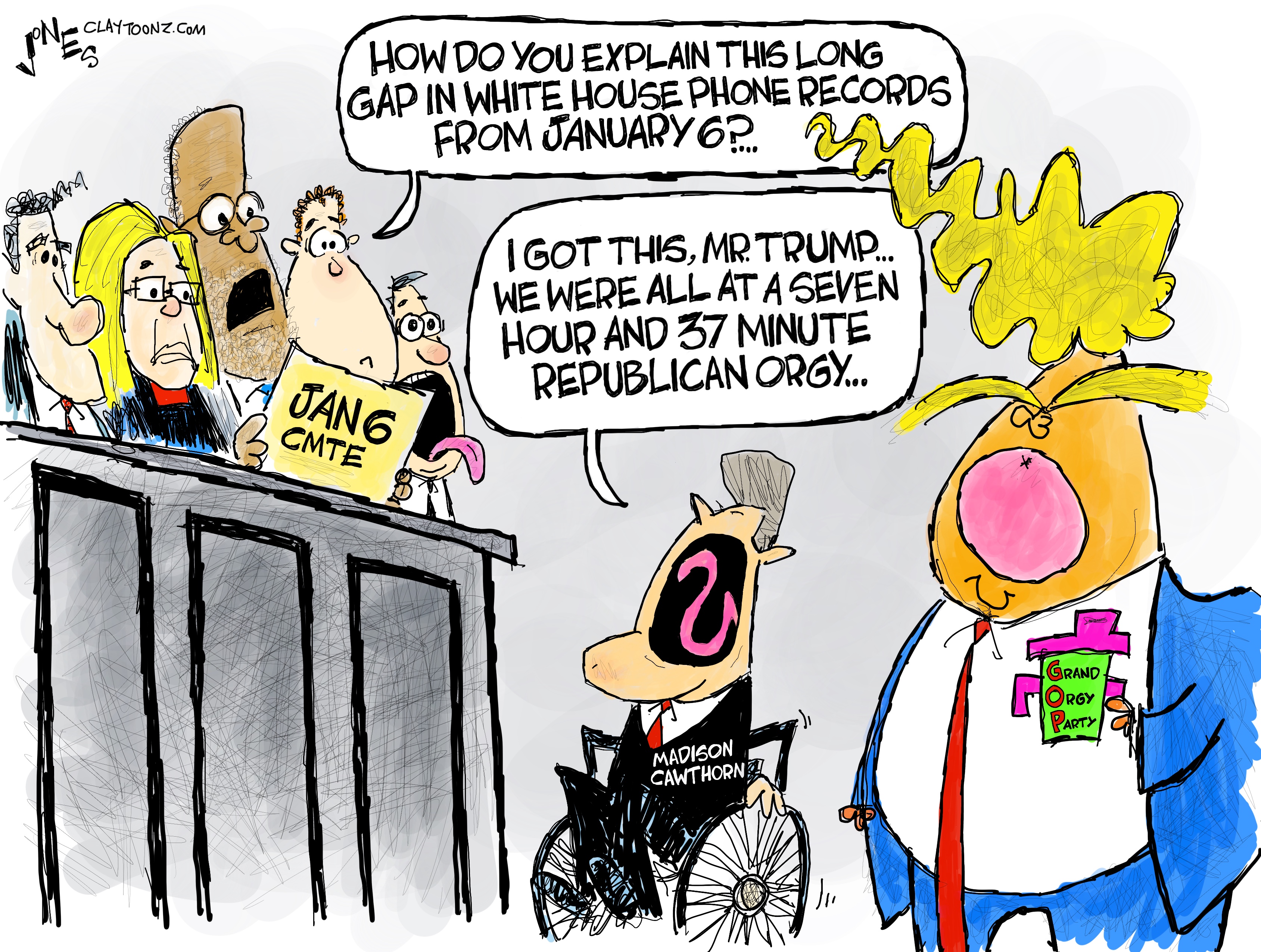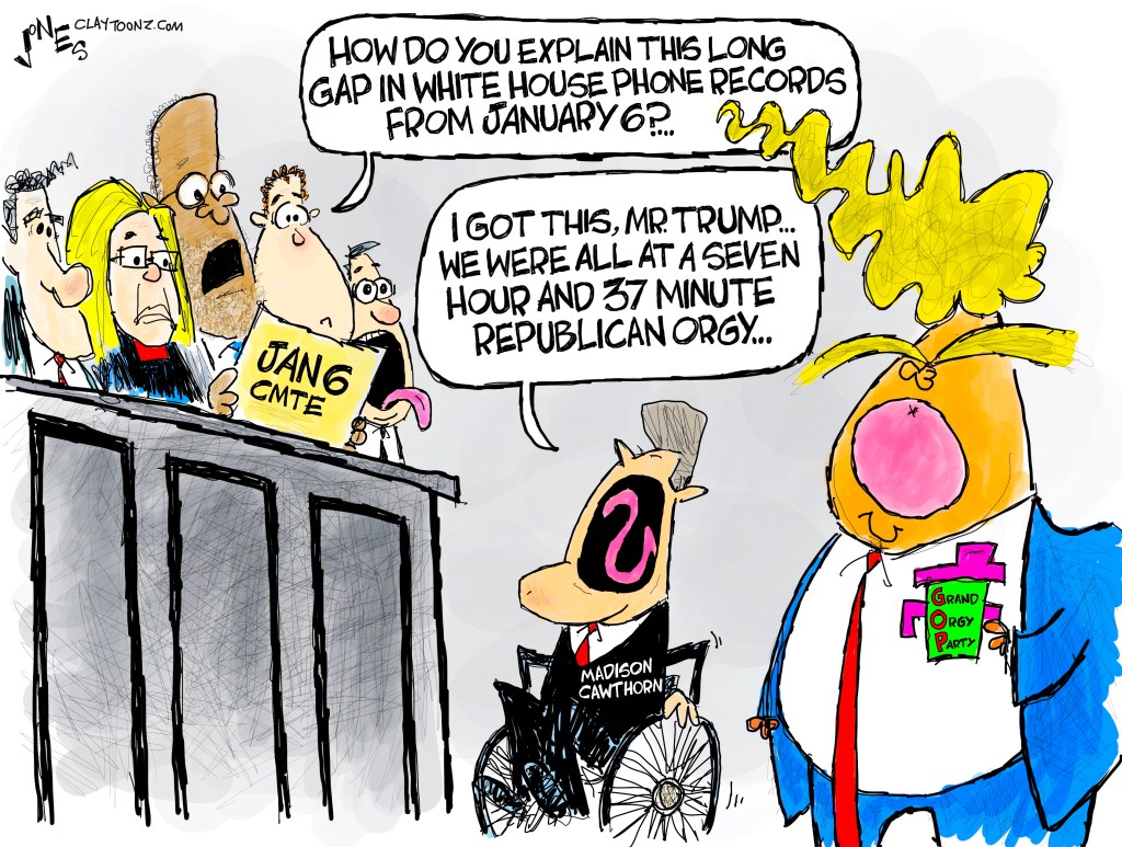 First off, orgies are icky…no matter who’s participating in them. But Republican orgies have to be one of the most disgusting things ever, like a nudist Trump rally with penetration. I need brain soap just to clean that image out of my head. I’m sure there’s a lot of perversion in DC, and when I find some, I’ll let you know. It’s also likely Madison Cawthorn has seen some shit, especially since he’s friends with Matt Gaetz, the guy who keeps rubbers in his office, shows nude photos to colleagues on the House floor, and has been credibly accused of sex trafficking minors. But I seriously doubt congressional codgers are inviting Madison Cawthron to orgies. And if there were congressional orgies, a handicapped guy would probably be invited just so nobody can accuse the event of not being inclusive. There should be a city ordinance that all Washington orgies are required to be wheelchair accessible.