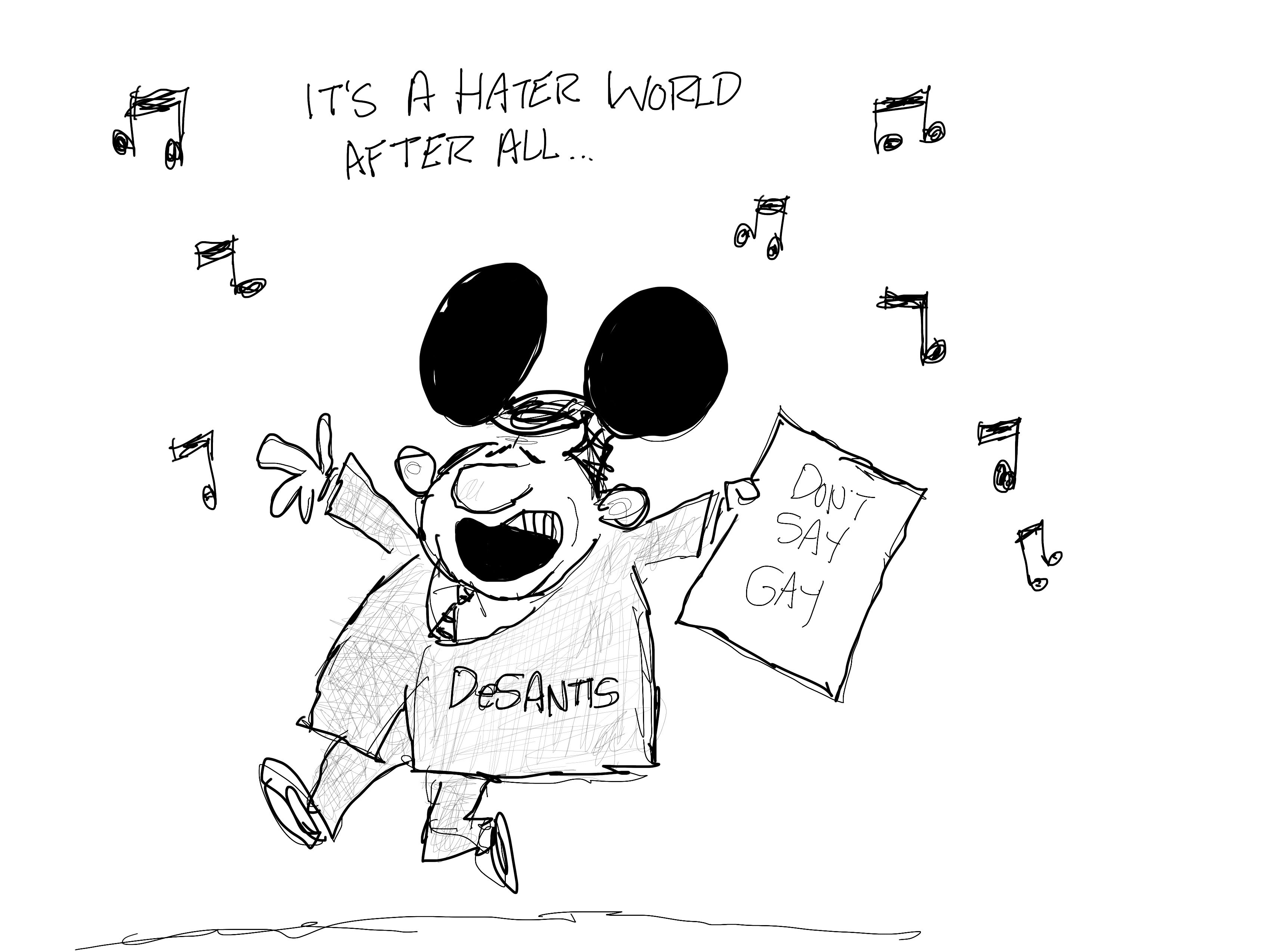 I didn’t go with this one as there were already a few cartoons with Mickey Mouse out there on the “Don’t Say Gay” issue in Florida. There’s been even more since I sketched this out over a week ago. Actually, now that I’m looking at it again, I’m kinda liking it.