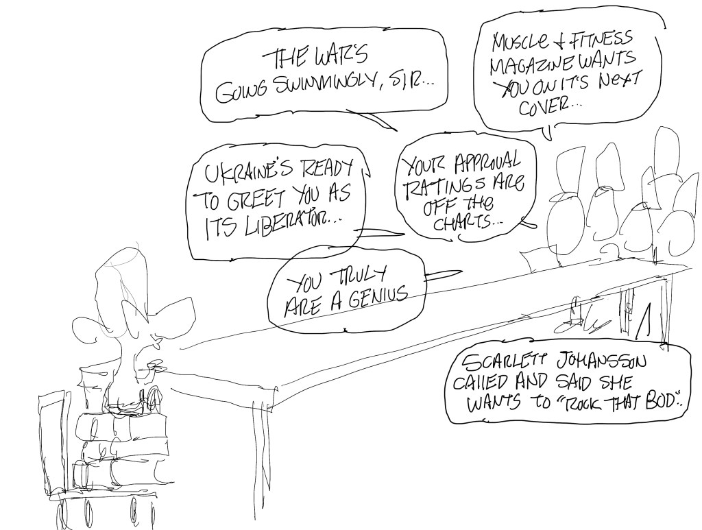 I drew this rough several weeks ago and put it aside because it had potential. I finally used the idea this week. See? You see the roughs eventually. I brought this back after the Bucha genocide.