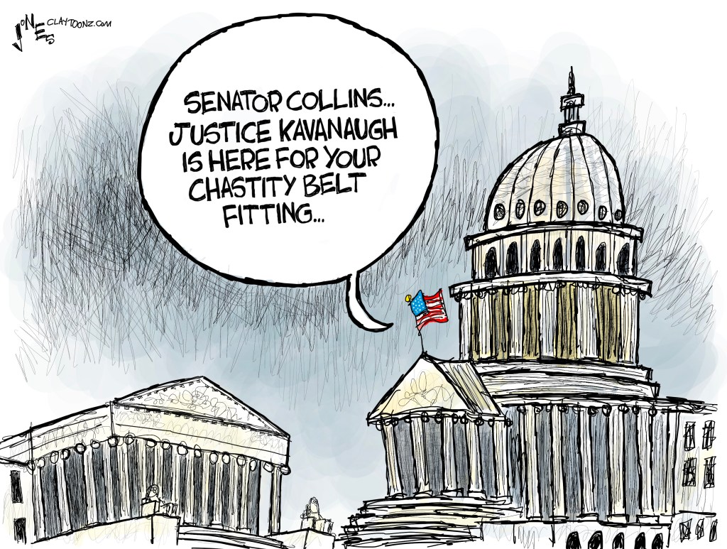 During a speech to the Senate, Collins said, “When I asked him would it be sufficient to overturn a long-established precedent if five current justices believed it was wrongly decided, he emphatically said ‘no.'” During his confirmation hearings, he said repeatedly that Roe had been upheld by Planned Parenthood v. Casey, describing it as “precedent on precedent.” So based upon the words that we all heard, I believe Kavanaugh went into Senator Susan Collin’s office, looked her in the eye, and lied his beer-swilling rapey balls off.