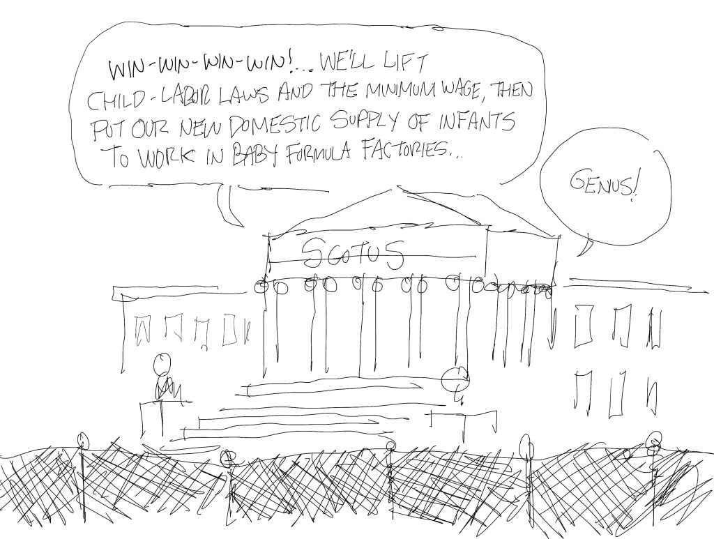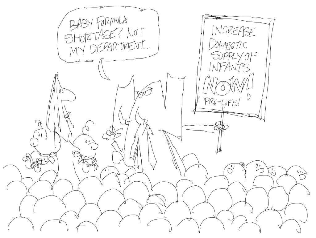 This is the one I turned “not my problem” into. AFTER I did this cartoon, congressional Republicans voted against a plan to solve the baby formula crisis and I thought, “I need to draw a cartoon on that.” And then I remembered, I already did before they voted against it.