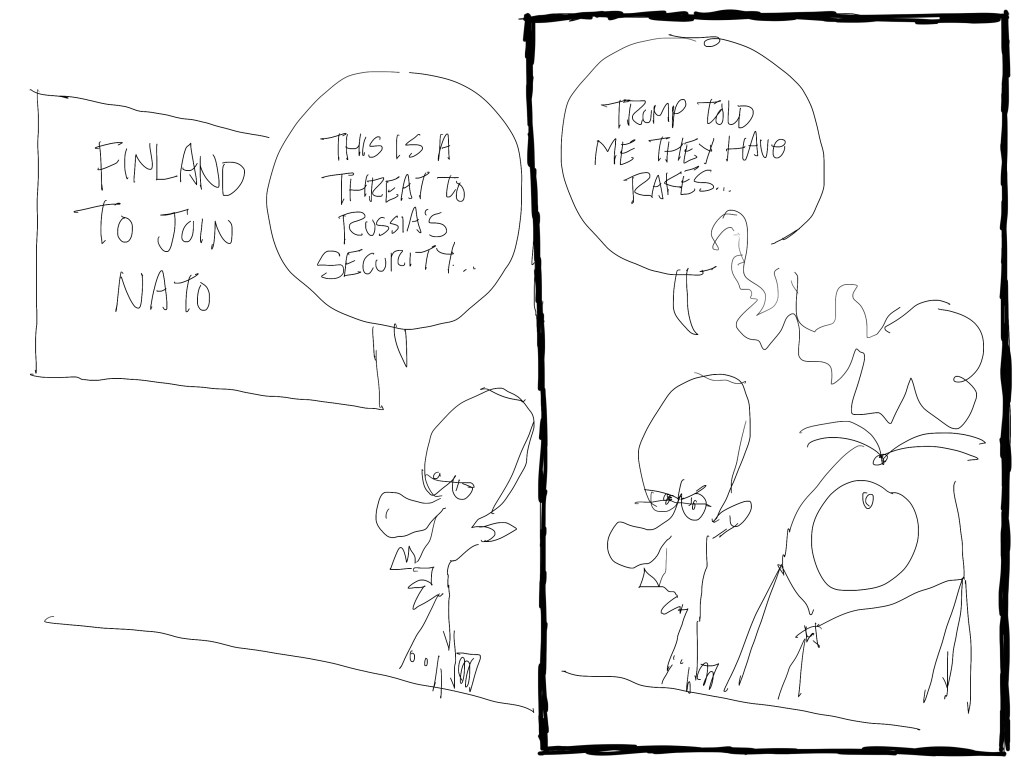 I kinda liked this one but pushed it aside for two reasons. One, Sweden got in on the act and I shouldn’t leave them out. Two, would anyone remember Trump’s Finland/rake thing? Also, I kinda like the way my Putin caricature turned out in this one.