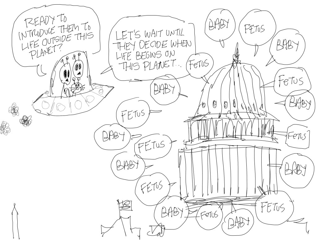 I really liked this one. It was drawn on Thursday of that week. But I had already drawn an alien cartoon with this same artistic layout for my newspaper clients. If CNN had picked it, I would have done something different with the design of it.