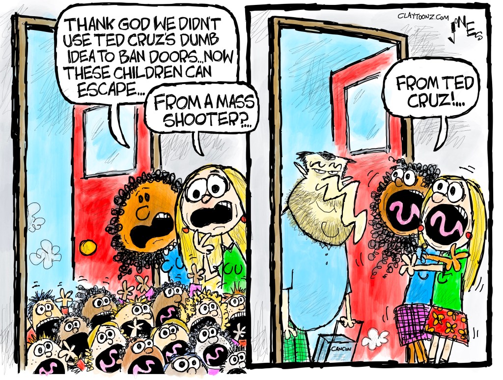 OK. I change my mind. He’s a moron. Only a moron would say something that stupid. And Ted didn’t say this off the cuff. He wasn’t riffing. He made this proposal during his speech at the NRA’s latest gun orgy in Houston, where it probably went over very well. I bet that convention hall had more than one door in it.