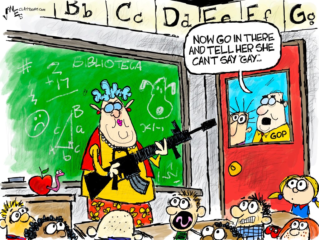The GOP way!! … “As Middle Age Riot on Instagram recently posted, “Republicans think it’s a good idea to give teachers less money, more students, fewer books, fewer resources, more parents in the classroom, more standardized tests, more scrutiny, more pressure, and a gun.”