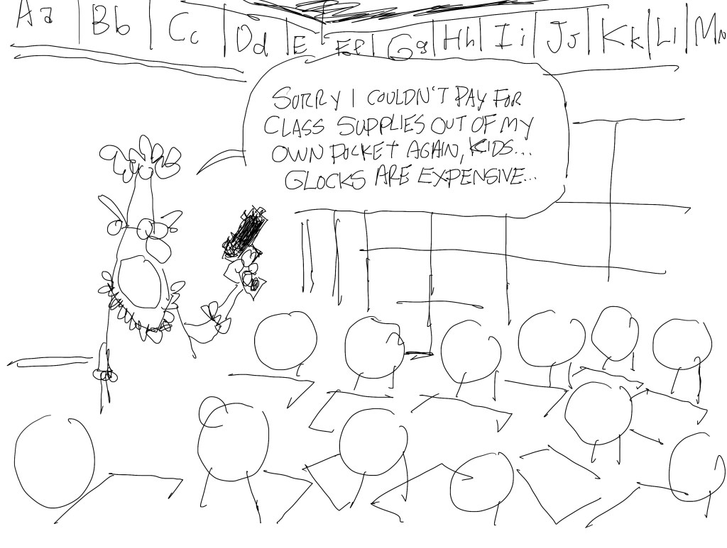 Glocks are expensive. I’ve looked into it. I liked the angle of desks around the teacher in this cartoon. I’m going to return to that. One reason I kicked this idea to the curb is that my last cartoon on teachers with guns went kinda viral. I was afraid this wouldn’t live up to it and yet, it’s probably going to be your fave in this batch.