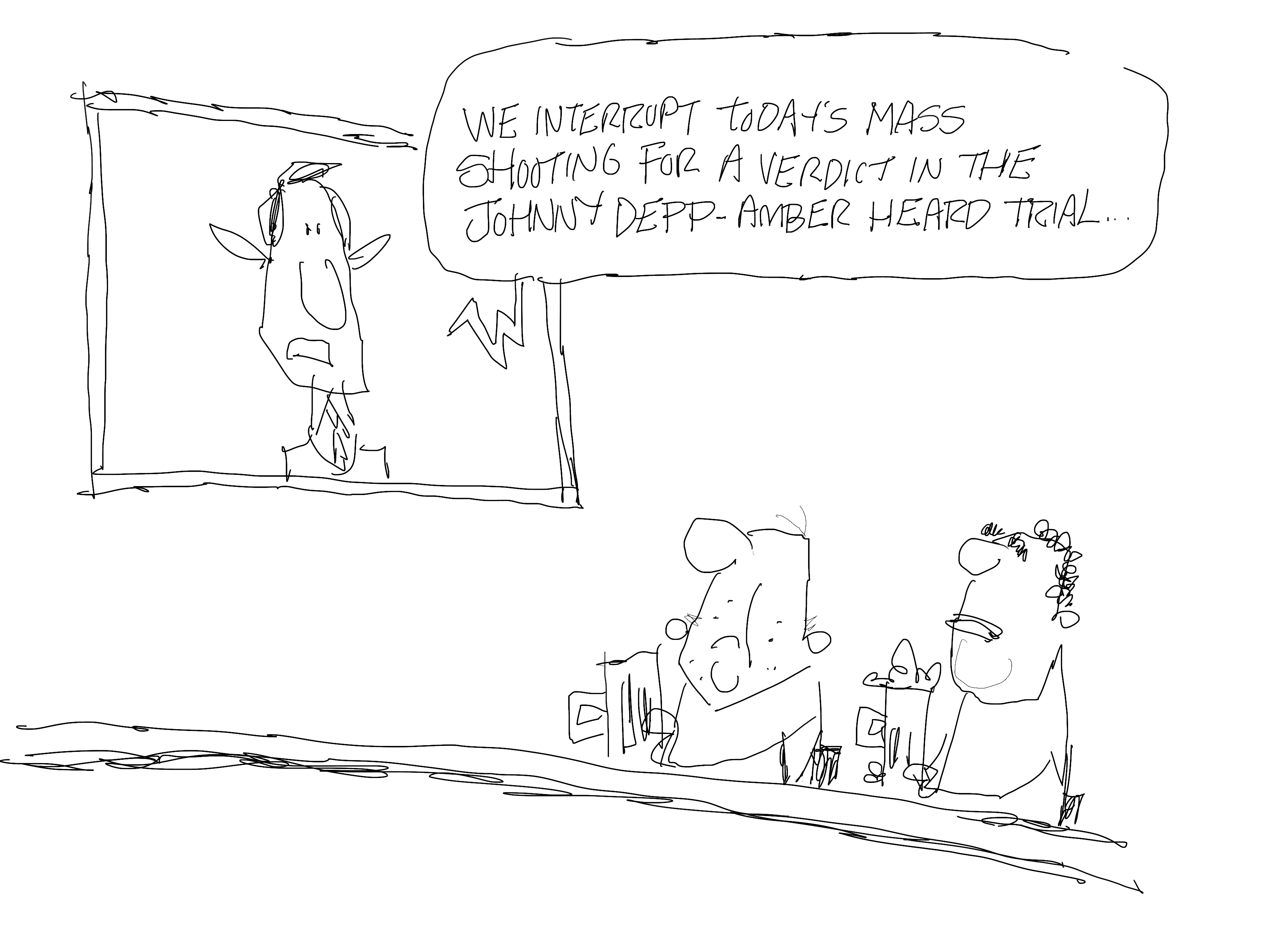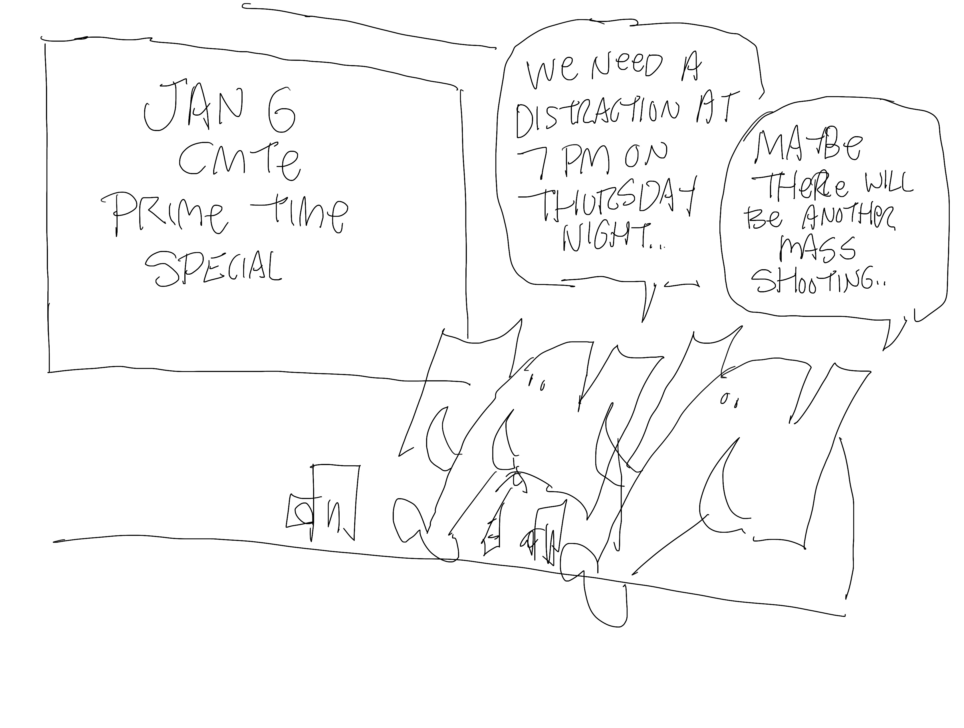 I did two cartoons on GOP distractions. One was for CNN and the other is this. This became an official cartoon for my newspapers. And as it turned out, there was a mass shooting on Thursday. And it’s another TV in a bar cartoon. I have a problem.