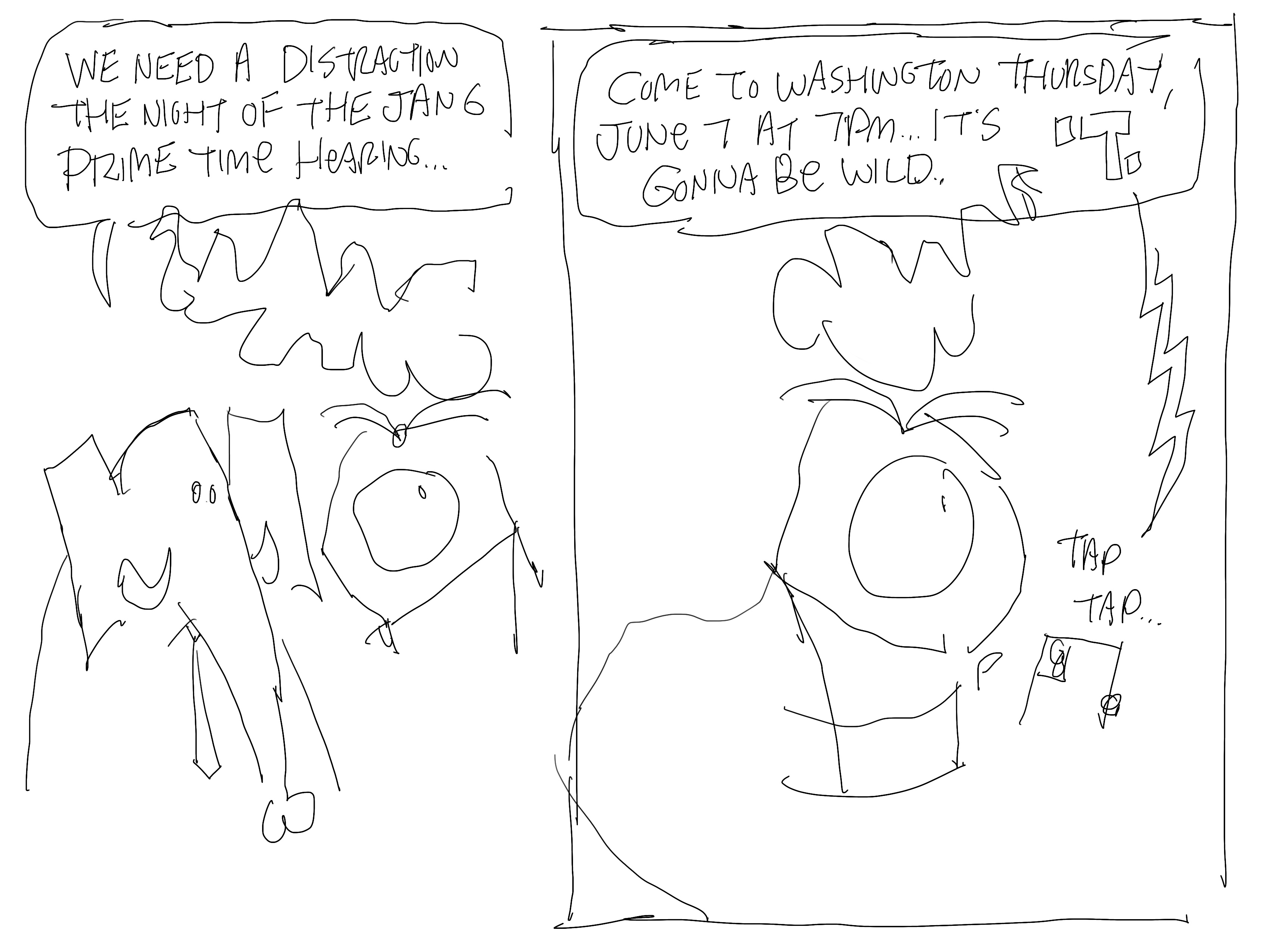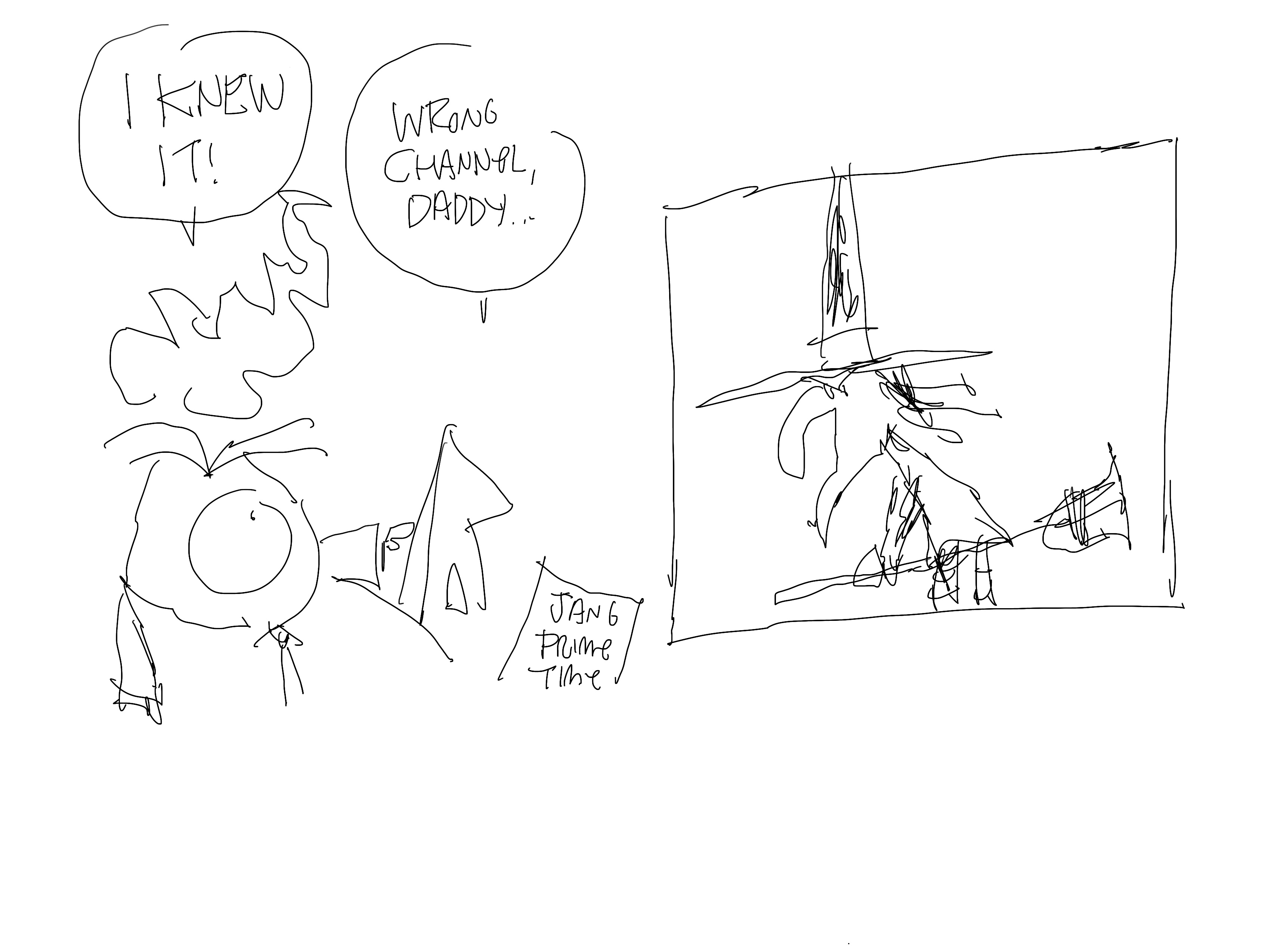 This sucks. I’m not sure what I was going for here. I think the idea was that he’s watching the Wizard of Oz and thinks it’s the January 6 Committee’s primetime hearing, and there’s a witch so obviously, the investigation is a witch hunt and yeah, it sucks.
