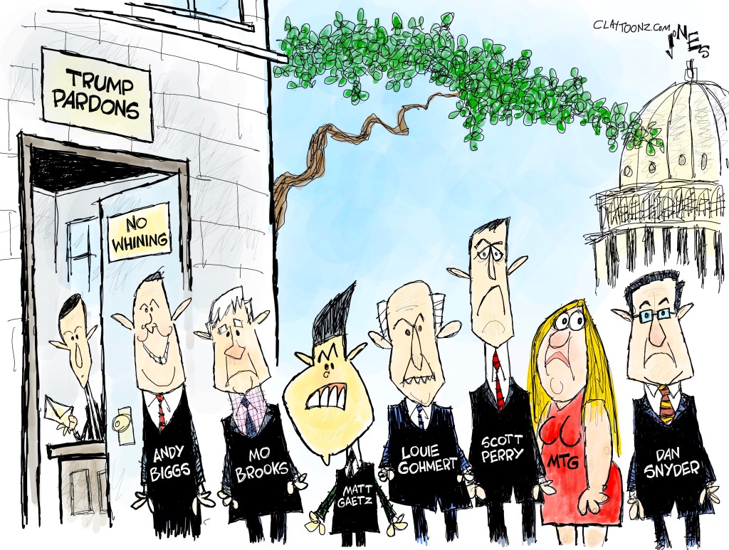 PARDON ME, PLEASE!! … “The list includes Andy Biggs, Mo Brooks, Matt Gaetz, Louie Gohmert, Scott Perry, and Marjorie Taylor Greene. Each were part of the Big Lie that Trump “won” the election and helped try to overturn the election their party lost. Each are enemies of democracy and support fascism.”
