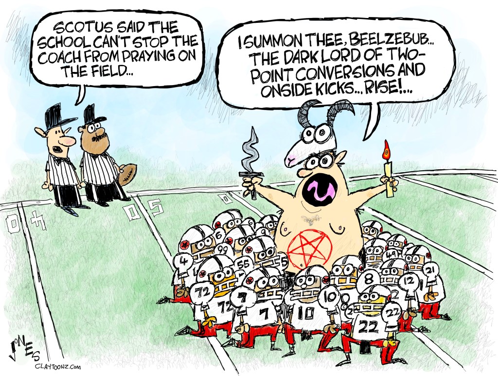 And that’s what I want. To freak people the fuck out…specifically, religious zealots who believe their religion takes priority and has greater rights than other religions. I want a liberal football coach somewhere in this nation (there has to be at least one) to conduct a Satanic ceremony after a public school’s football game on the 50-yard line. Neil Gorsuch rules that a coach can do that so I’m sure the school district won’t fire a coach for leading a Satanic prayer at a football game. And, even if that prayer summons a demon, Justice Gorsuch says that demon is allowed at a public school setting. Maybe a demon would enjoy a high school football game. Do demons like hotdogs? And, it wouldn’t be the first time someone summoned a demon to help with their football game. Ask Tom Brady.