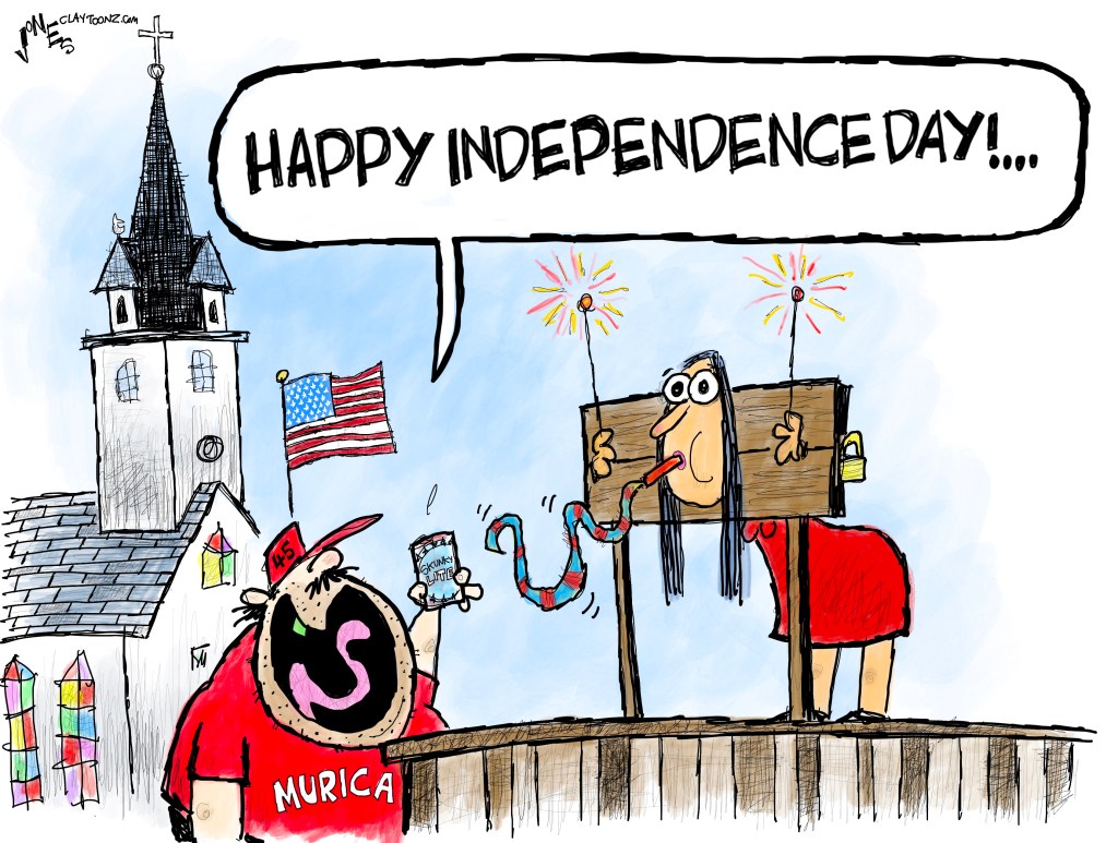 There’s a lot of hypocrisy that comes with celebrating Independence Day. For example, right-wing cartoonists who supported Donald Trump’s insurrection will publish red, white, and blue rah-rah flag-waving cheerleading bullshit on July 4th. These goons are the same goons who defend Ashli Babbitt and cry for her. This is like celebrating the Fourth of July while worshipping Benedict Arnold.