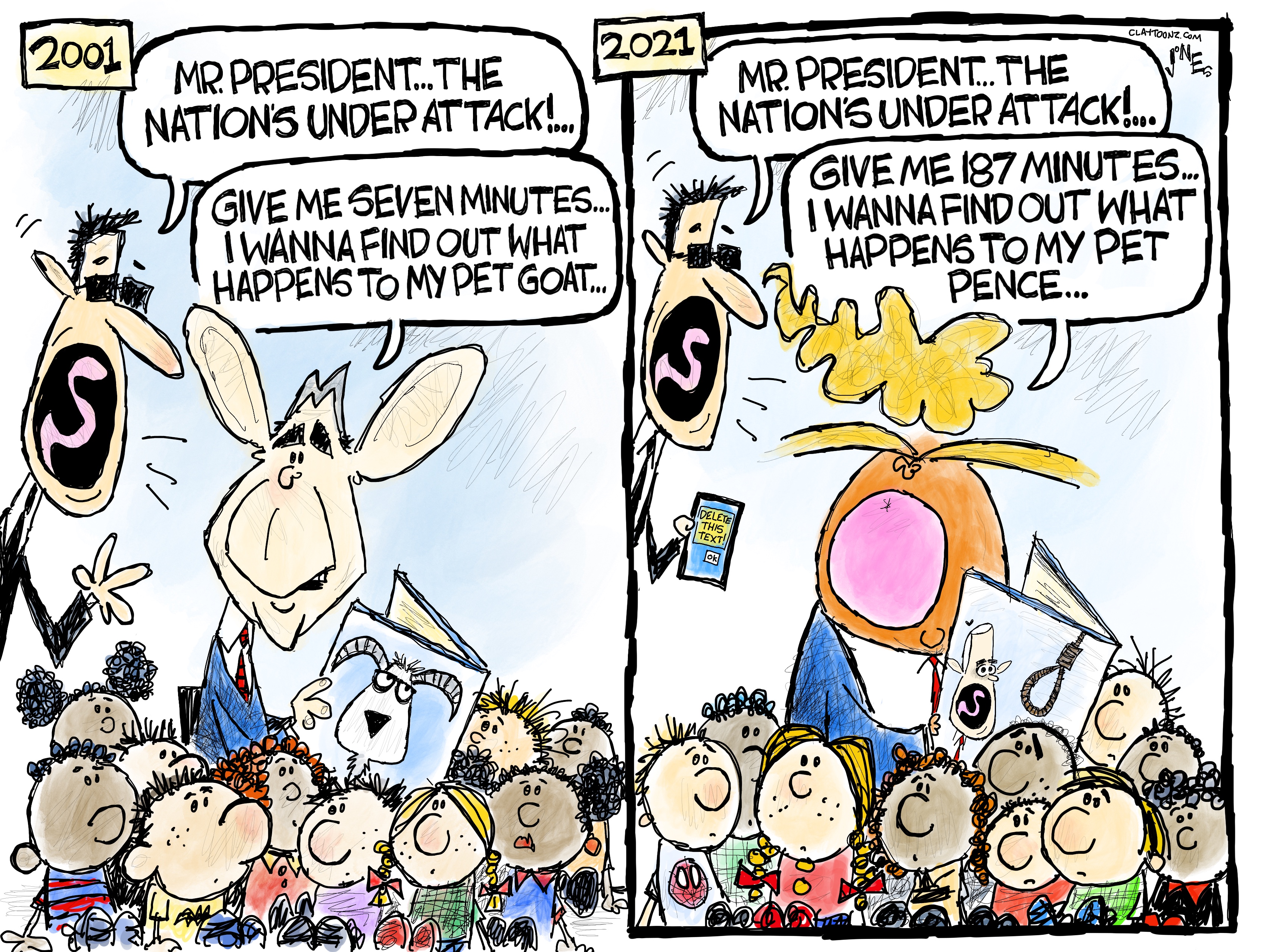 After seven minutes, George W. stood up and did something to thwart further attacks and save American lives. He at least tried. Donald Trump did something during that 187 minutes and that was to give the attackers encouragement and support. He tweeted that Vice President Mike Pence “let us down,” further goading the attackers who brought nooses and started chanting “hang Mike Pence.”