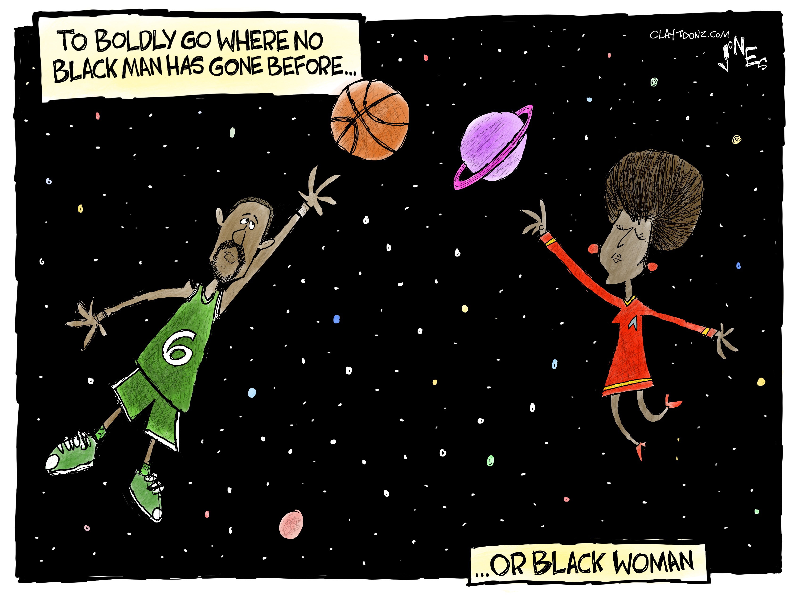 If you’re a regular reader of this blog, then you know I don’t love what we call in my industry, “obituary” cartoons. I don’t like drawing a cartoon commemorating someone’s death only because that person was famous. I would rather memorialize someone who contributed something to society, whether positive or negative. What made it important for me to draw a cartoon on Nichelle Nichols and Bill Russell is that they were both pioneers in advancement for black people and they both died a day apart. It felt it was appropriate to put them together.