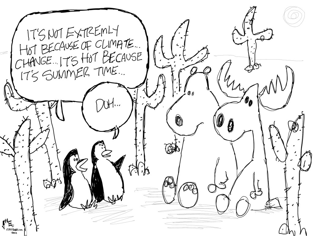 Everyone and their brother drew weather cartoons over the past week, and I was about to draw this one but other stuff got in the way. My position on weather cartoons is, don’t draw them unless you want to suck. Now drawing climate cartoons, that’s different. This is a climate cartoon. I was actually inspired by a really stupid cartoon drawn by a really stupid right-wing MAGAt cartoonist that said the reason it’s hot is that it’s summer. Of course, he’ll shit out a cartoon this winter saying snow in Denver in January proves Global Warming is a hoax. I just can’t even with motherfuckers. I just can’t.