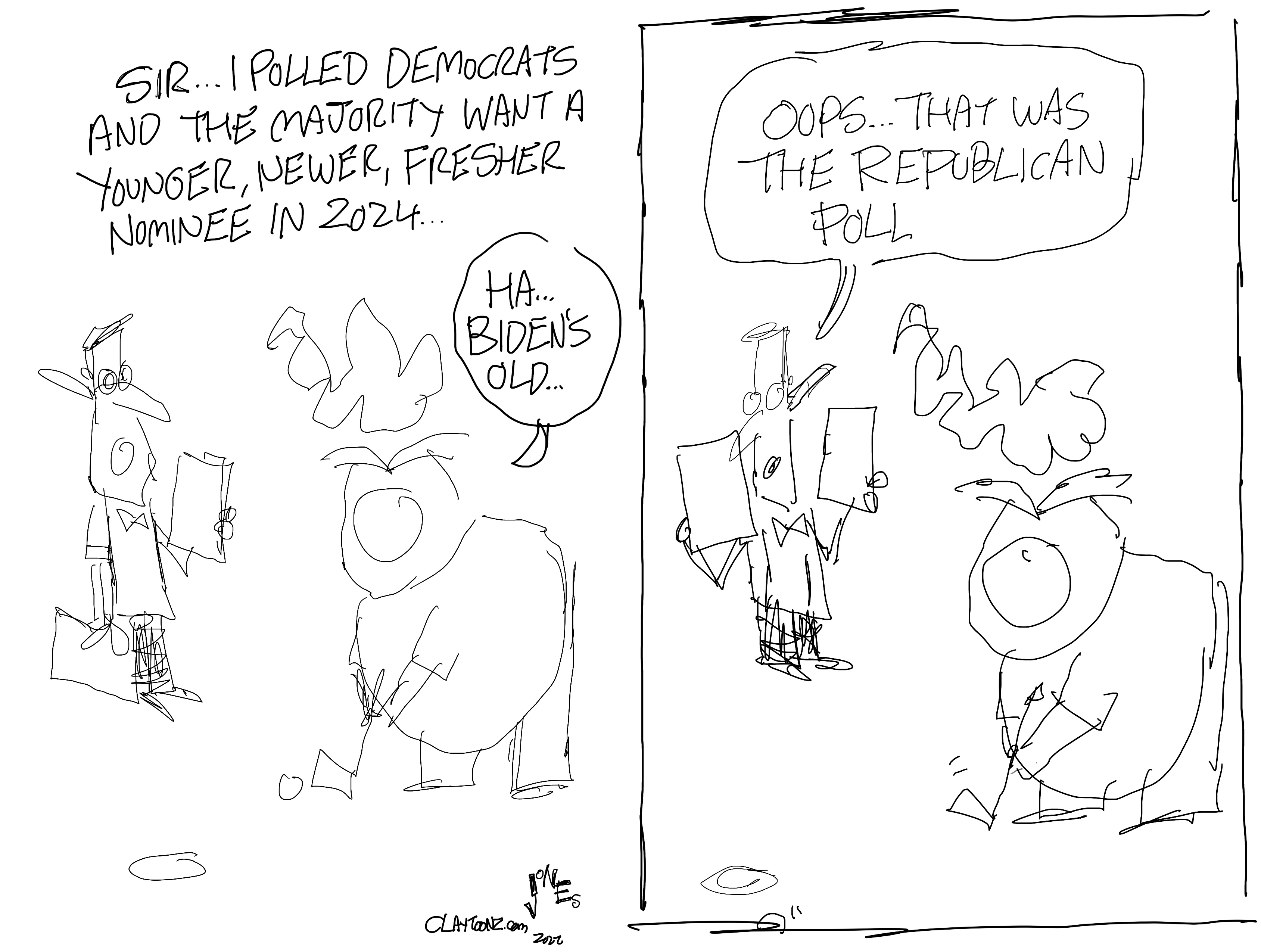 Signed prints: The signed prints are just $40.00 each. Every cartoon on this site is available. You can pay through PayPal. If you don’t like PayPal, you can snail mail it to Clay Jones, P.O. Box 3721, Fredericksburg, VA 22402. I can mail the prints directly to you or if you’re purchasing as a gift, directly to the person you’re gifting.