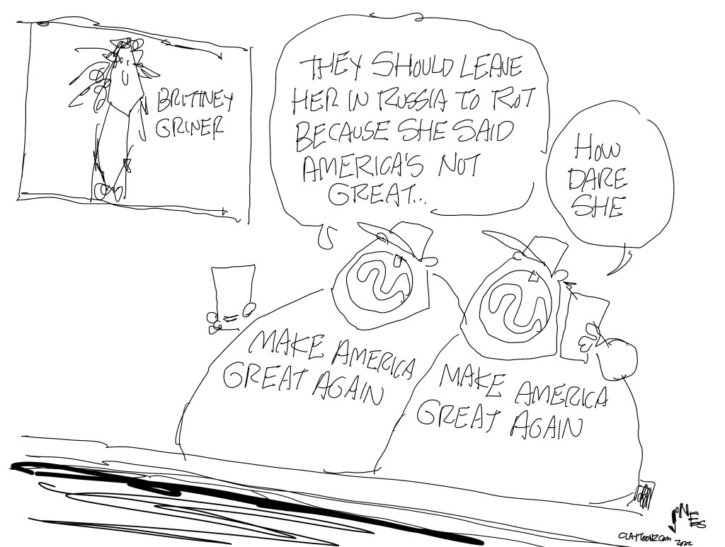 While I don’t like this cartoon, this is some more bullshit that pisses me off. I’m on Truth Social as an experiment and to be honest, I don’t interact or engage a lot with the users there, but they’re terrible people. They’re the worst. They comment on my work and they argue that Brittney Griner should be forced to stay in Russia since she’s criticized the United States. how dare she. Meanwhile, they’re all kissing the big orange ass of a guy whose motto is “make America great again.” They wear hats that literally say our nation isn’t great.