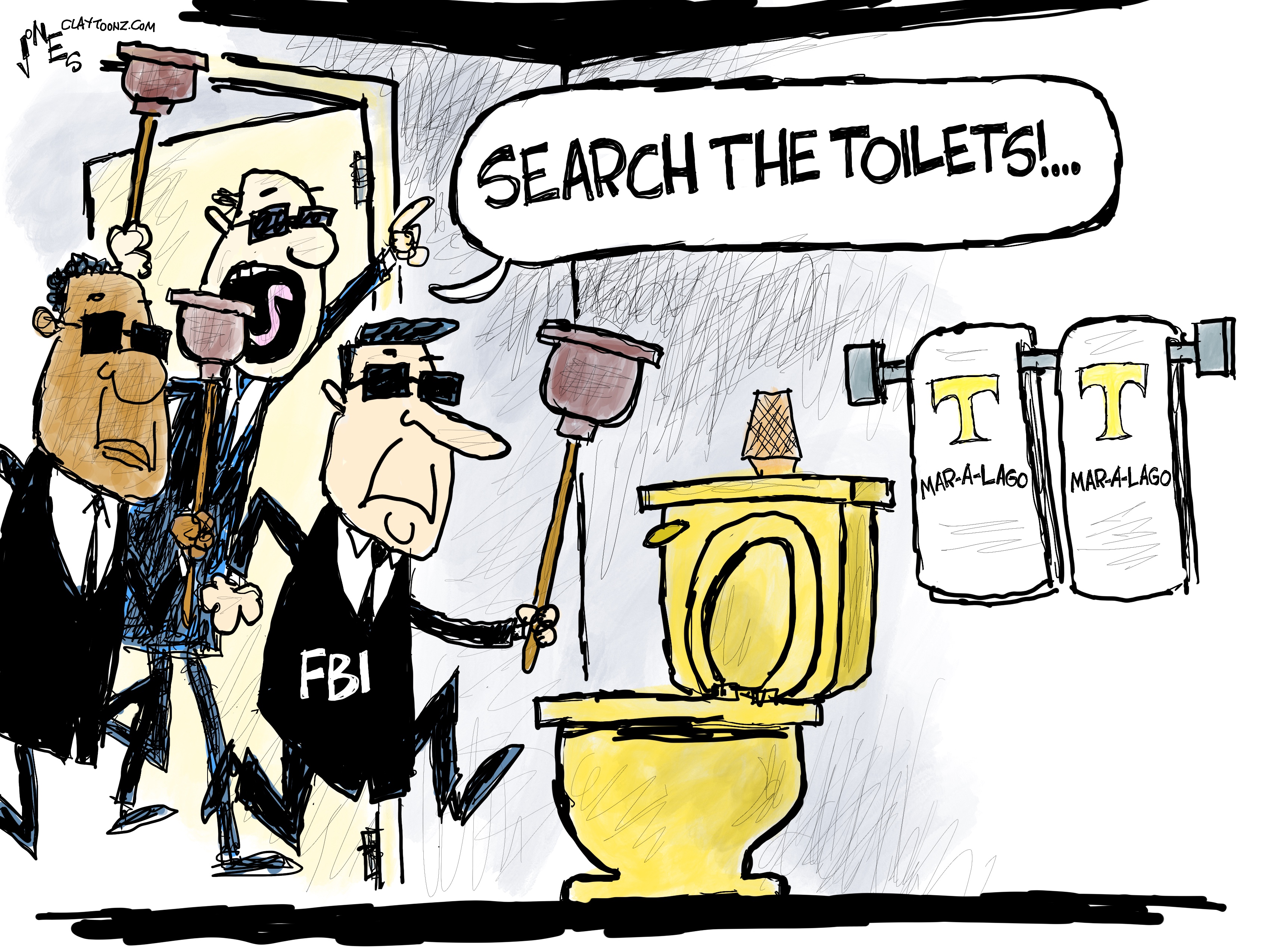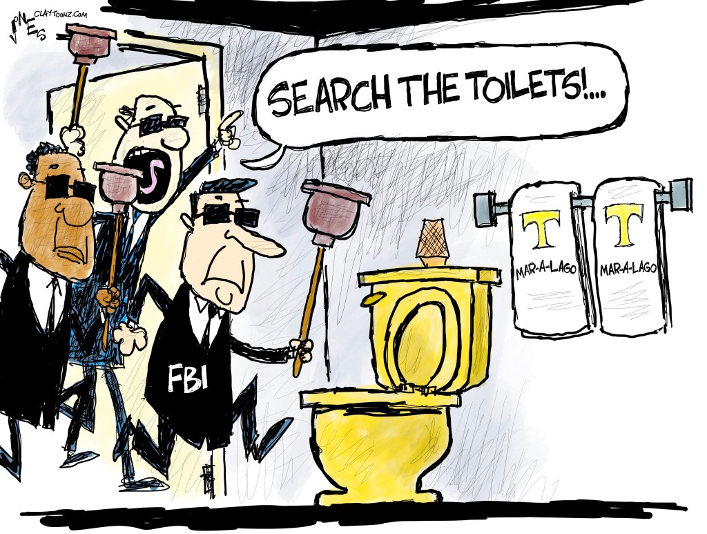 From the sky Mar-A-Lago resembles a sort of toilet bowl surrounded by palm trees and parking lots. The toilet bowl administration of 2016-2020 just won’t stop overflowing. I notice there is no roll of toilet paper in your rendering of this historic event. Then it came to me … who needs toilet paper when you have boxes and boxes of potentially incriminating, confidential, national security, top secret documents to wipe clean with … beats the sears catalog and so in tune with the tangerine president’s ego and narcissism!