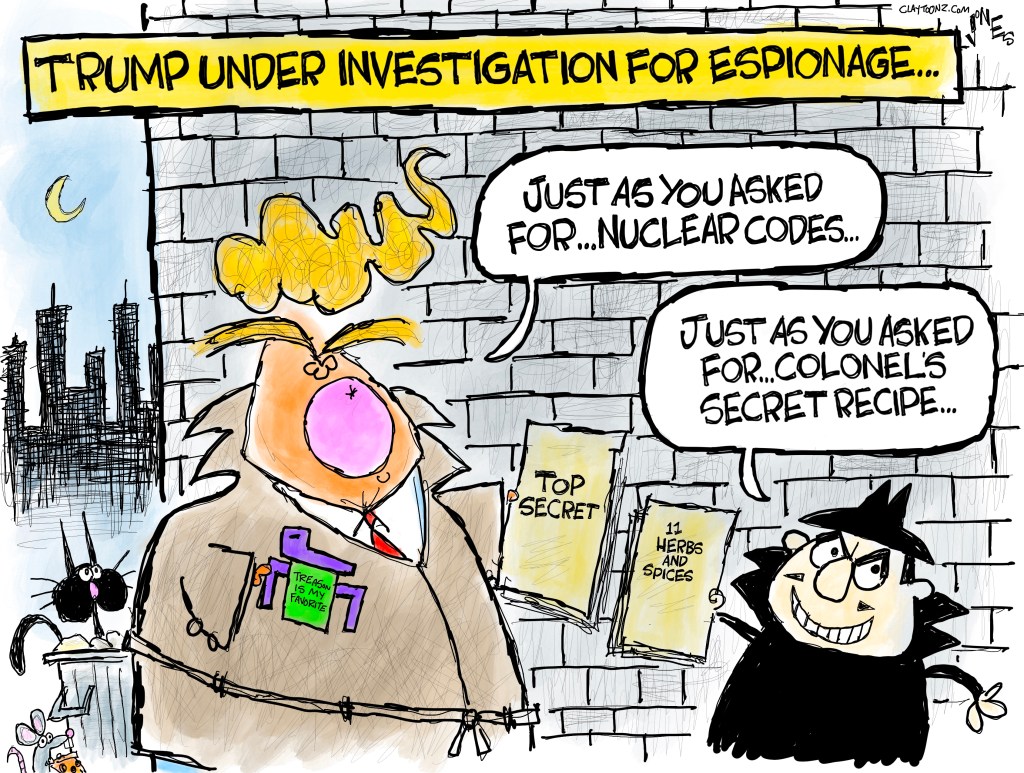 We learned from the unsealing of the search warrant giving the FBI permission to search Mar-a-Lago that they’re investigating Trump for violating the Espionage Act, mishandling of documents, and obstruction of justice (which he’s done before).