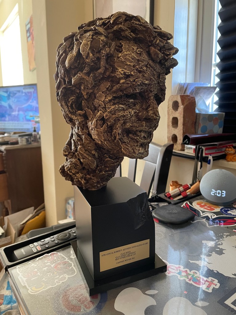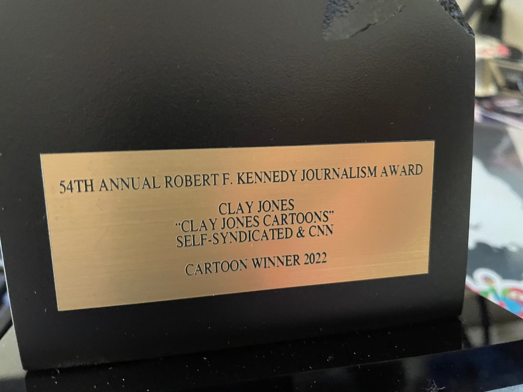 As you probably already know, I won the Robert F. Kennedy Human Rights journalism award for cartooning last May. They did a very nice online presentation since COVID denied us all an in-person awards banquet. Stupid COVID. I hate you, COVID. The check for winning arrived a couple of weeks ago and last night, or sometime during the day (I’m not sure when), the trophy arrived.