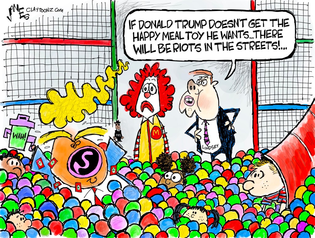 Creative note: The first version of this cartoon had Ronald behind a counter, Lindsey saying his line, and Trump crying on the floor. But it was lacking something. Naturally, it was after I finished lettering that the ball pit idea came to me. So, I trashed the first version and started over despite it being after 12 p.m. on a Tuesday. I did a Google search of worst Happy Meals but nothing fit the bill until I thought of what you see in the cartoon.
