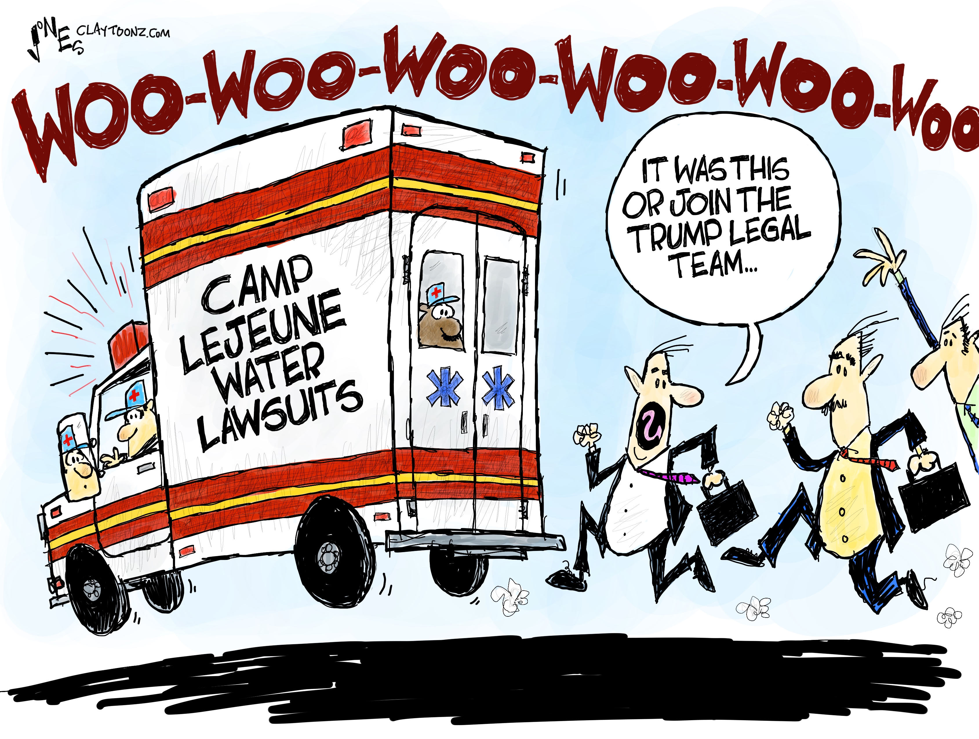 Creative note: I got this idea from my Friend Mike Peterson, who does the Comic Strip of the Day thing. He blasted out a Facebook post about Camp Lejeune and ambulance chasers, though he referenced South Carolina when the base is in North Carolina. C’mon, Mike. North and South Carolina are not the same places. They’re not the Dakotas. But anyway, thanks for the inadvertent assist.